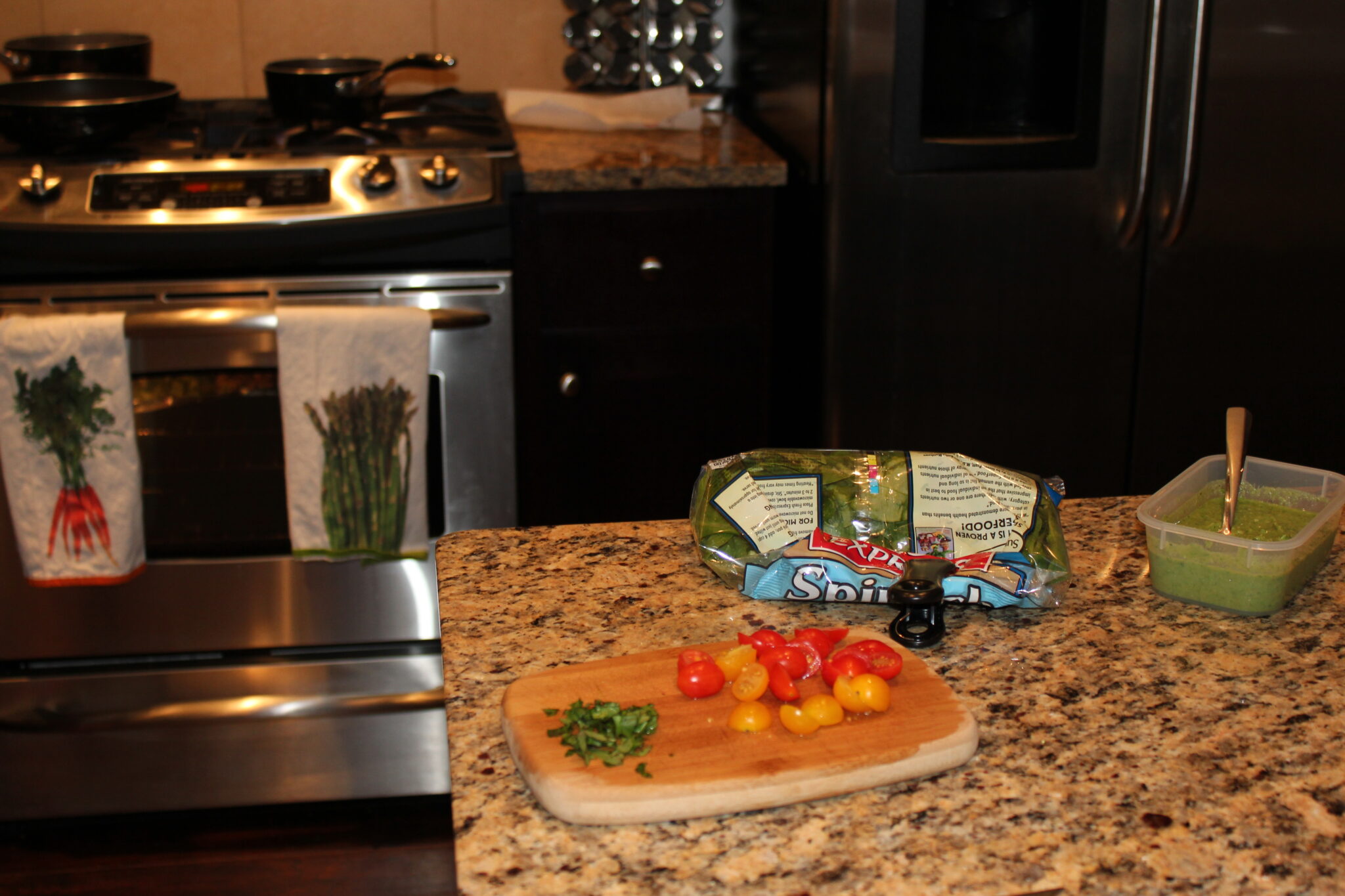 This has a ton of flavor, and works great as a sauce as well. Before the 10K last weekend, I roasted up a bunch of veggies and a frozen filet of tilapia, sautéed some spinach, basil, and cherry tomatoes, and stirred it all together with ½ serving of whole grain pasta. I topped it all off with a few dollops of this hummus, and it was delicious!