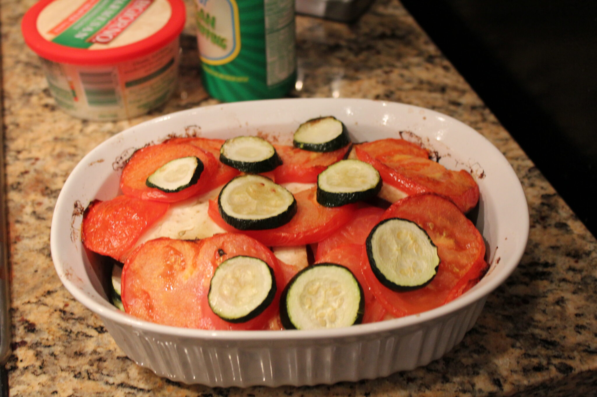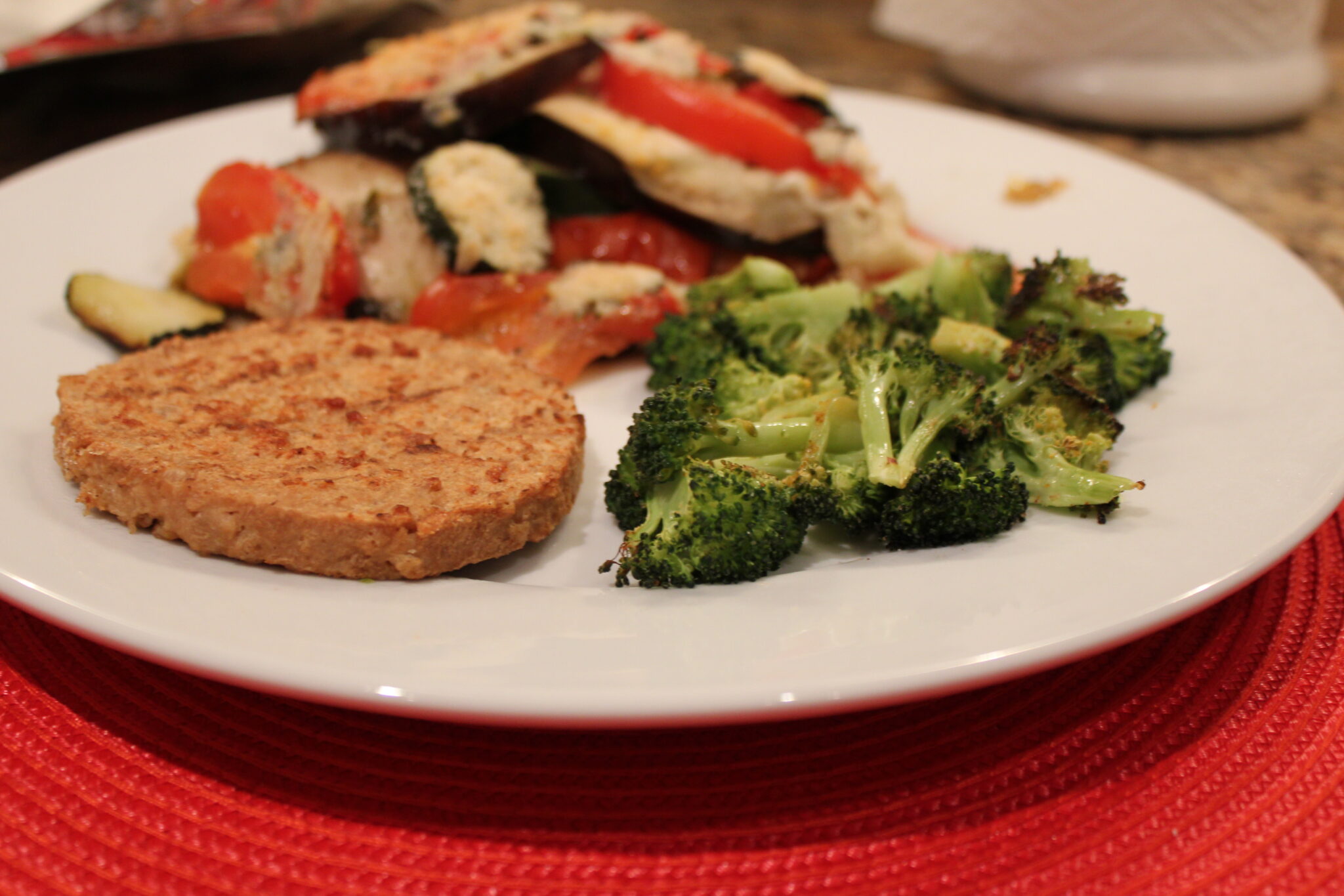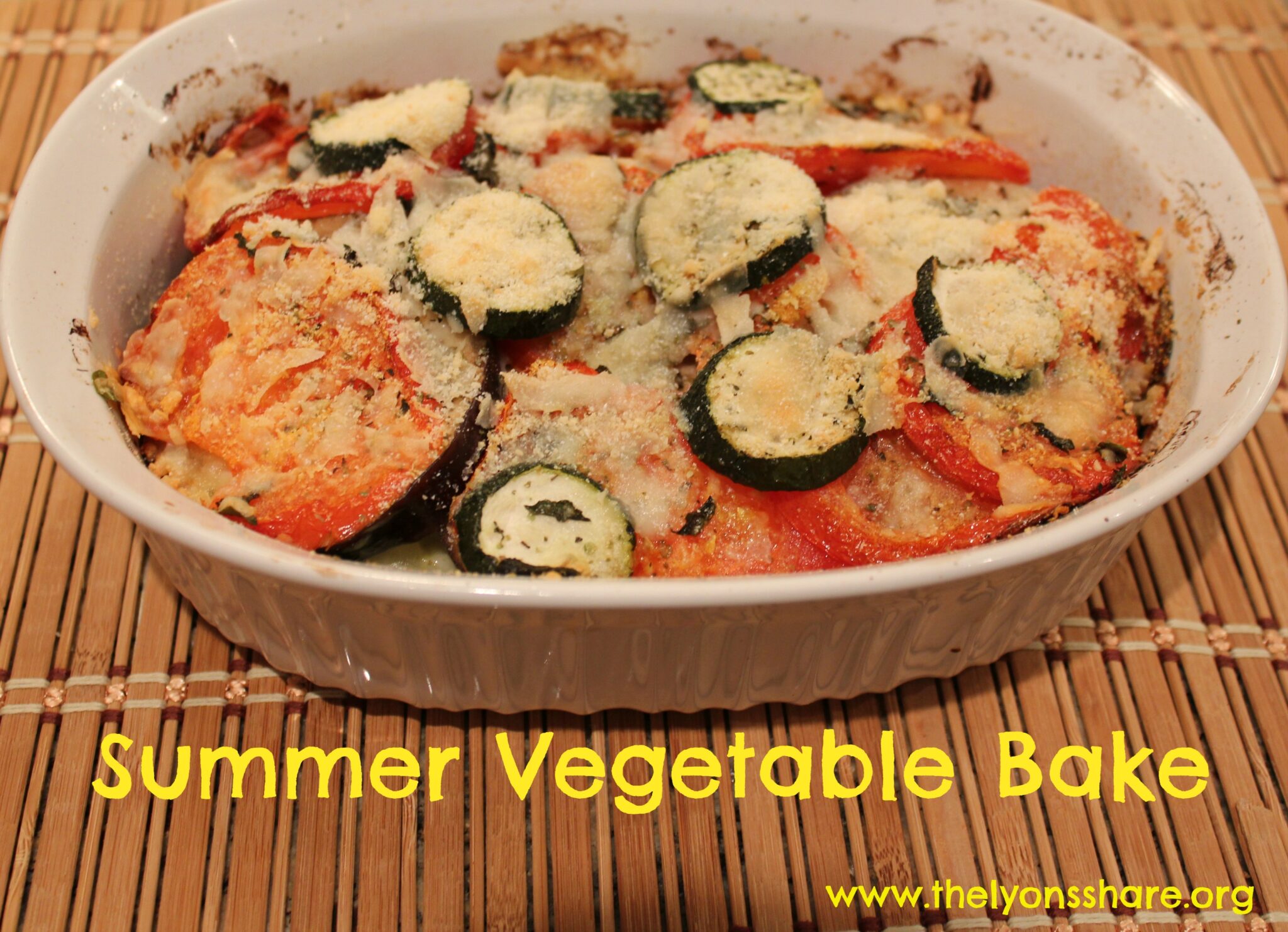 8. Dig in and enjoy!  I served mine (the first time) with a veggie burger and some roasted broccoli, but this is very versatile – tonight we’ll be having it with grilled, herbed chicken/ tofu and pasta. summer vegetable  bake dinner