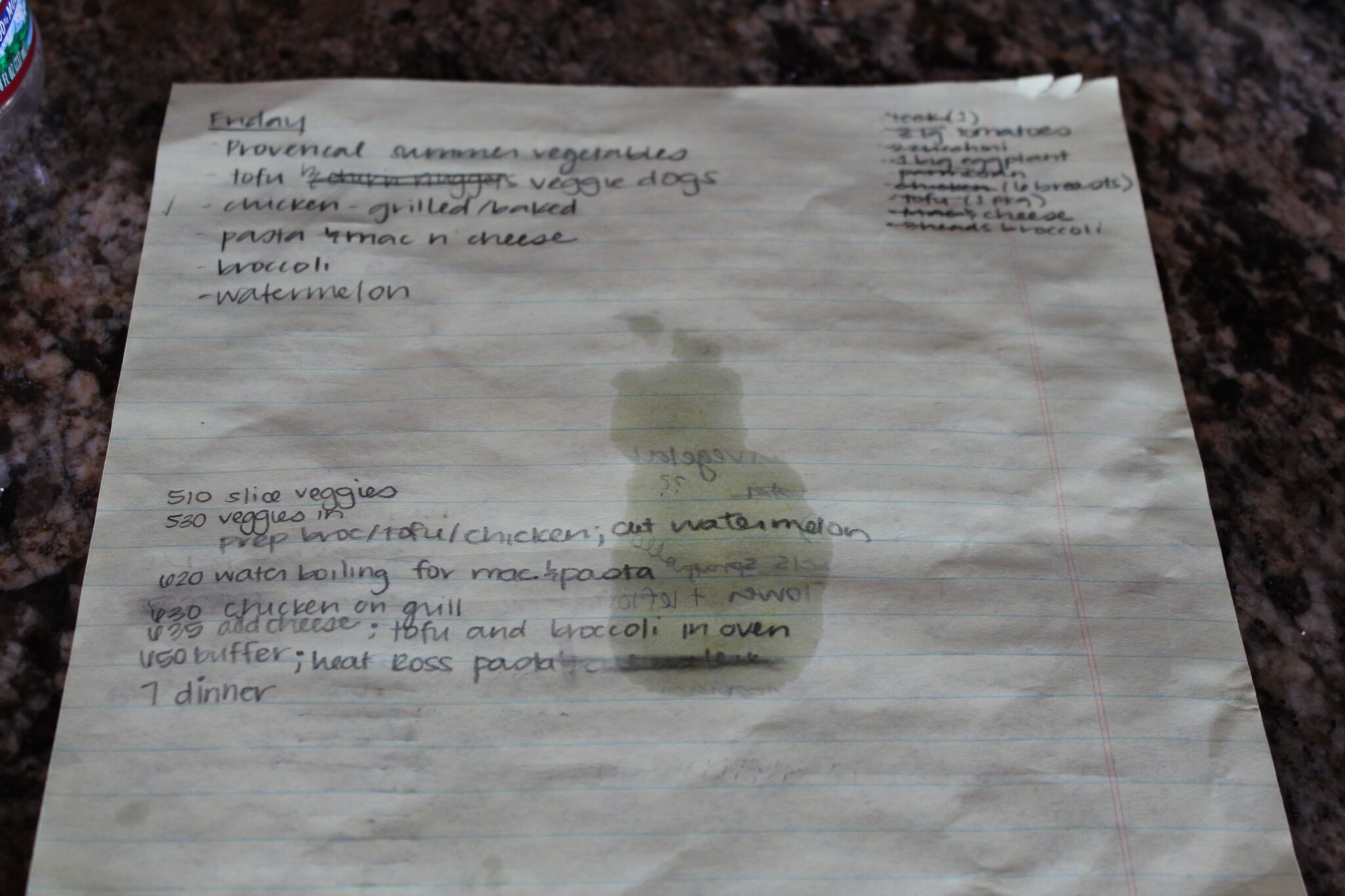 - Plan, plan, plan! I’m a planner in everyday life (I love my “to do” lists, and having a daily schedule makes me more relaxed), but planning becomes even more important when you’re cooking for a group. As you’ll see in the (well-loved and oil-stained) list below, I planned the nightly dinner menu on the left side of a legal pad, and the groceries we’d need for each dish on the right side of the pad. I made sure to take into account the various dietary preferences of the group, included a healthy dose of vegetables at each meal, and looked for some variety (resist the urge to serve a different version of chicken every night if you’re cooking for a week!).