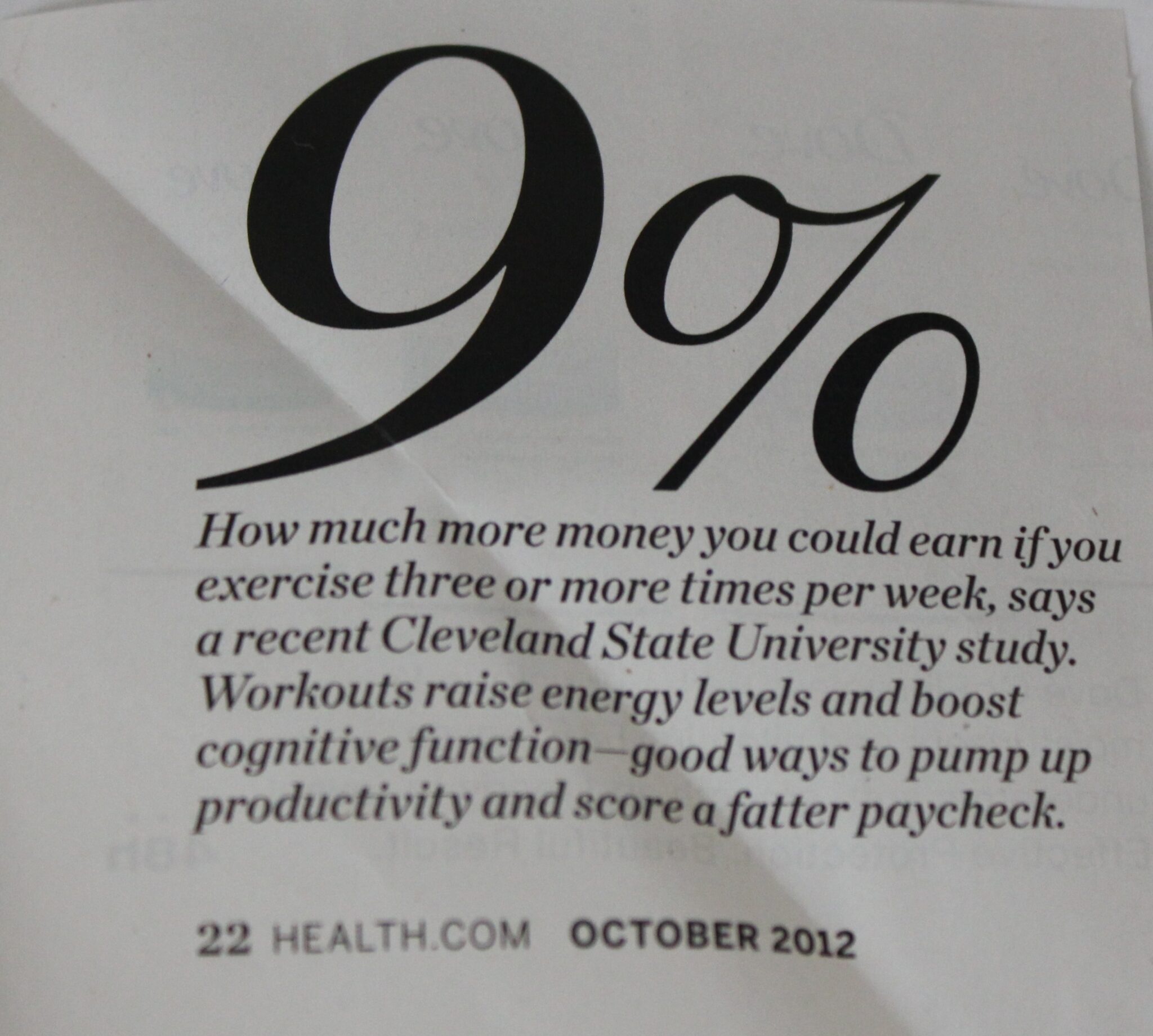 - Employees who exercised 3+ times per week earn 9% more than their counterparts who do not exercise. This TIME article explains the study well.