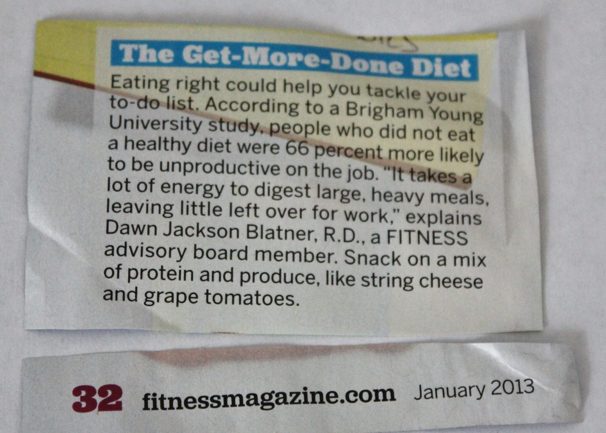 The relationship between work and health doesn’t have to be all negative, though … did you know that living a healthy lifestyle will actually improve your performance at work? I found these three fascinating statistics in magazine articles (I don’t always believe everything magazines report, but these seem to be legit … and yes, I’ve been saving magazine articles for several years in case I ever started a blog!).