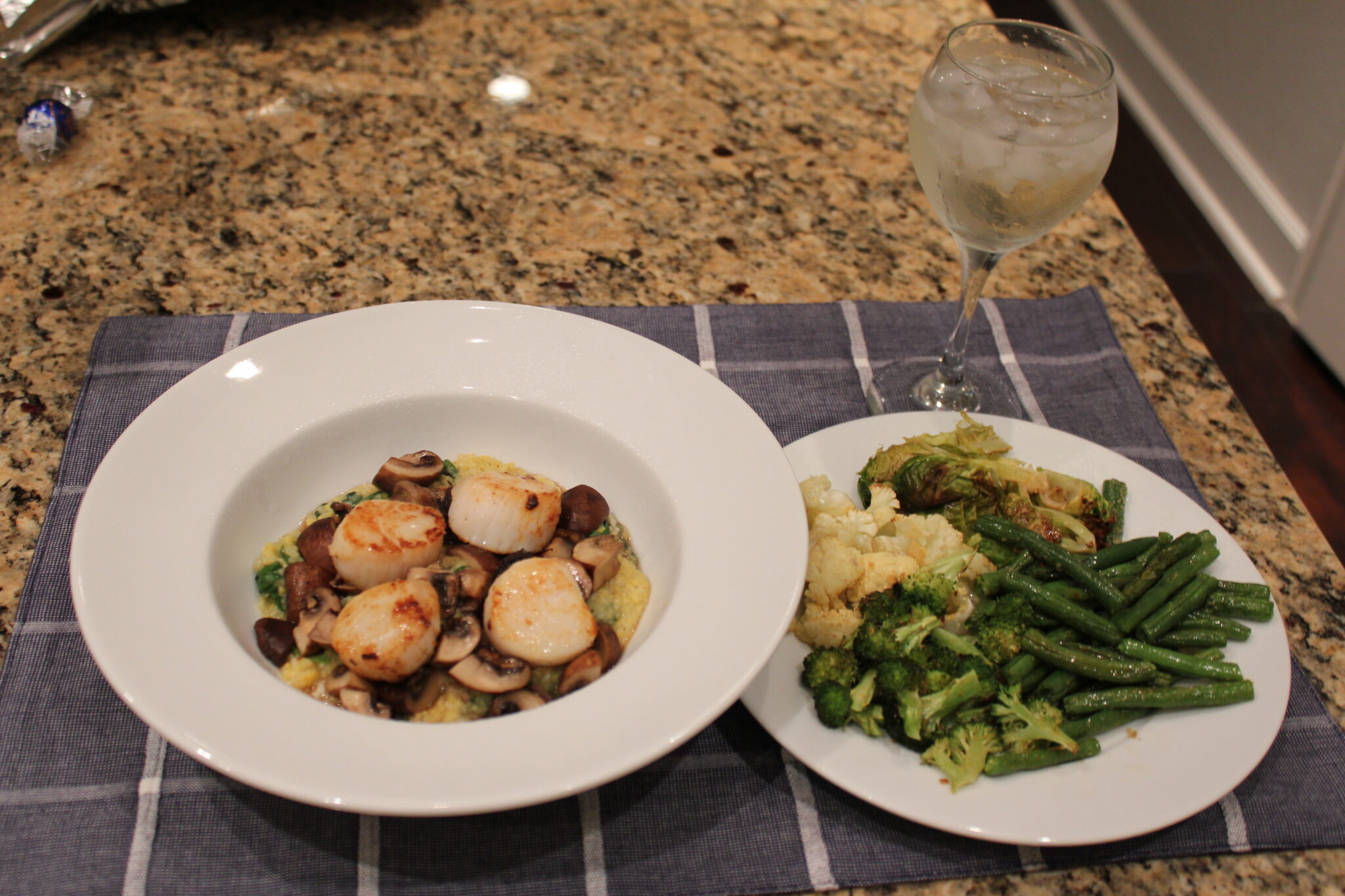 - I layered the polenta on the bottom of a bowl, then the mushrooms, and topped with the scallops.