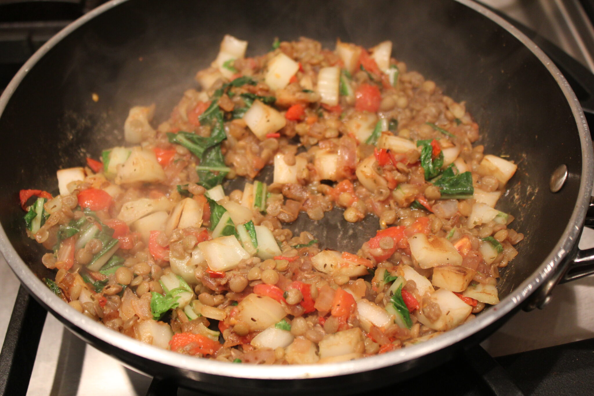- After another 3-4 minutes, add in cooked, drained lentils, and cook while stirring for 2 more minutes.
