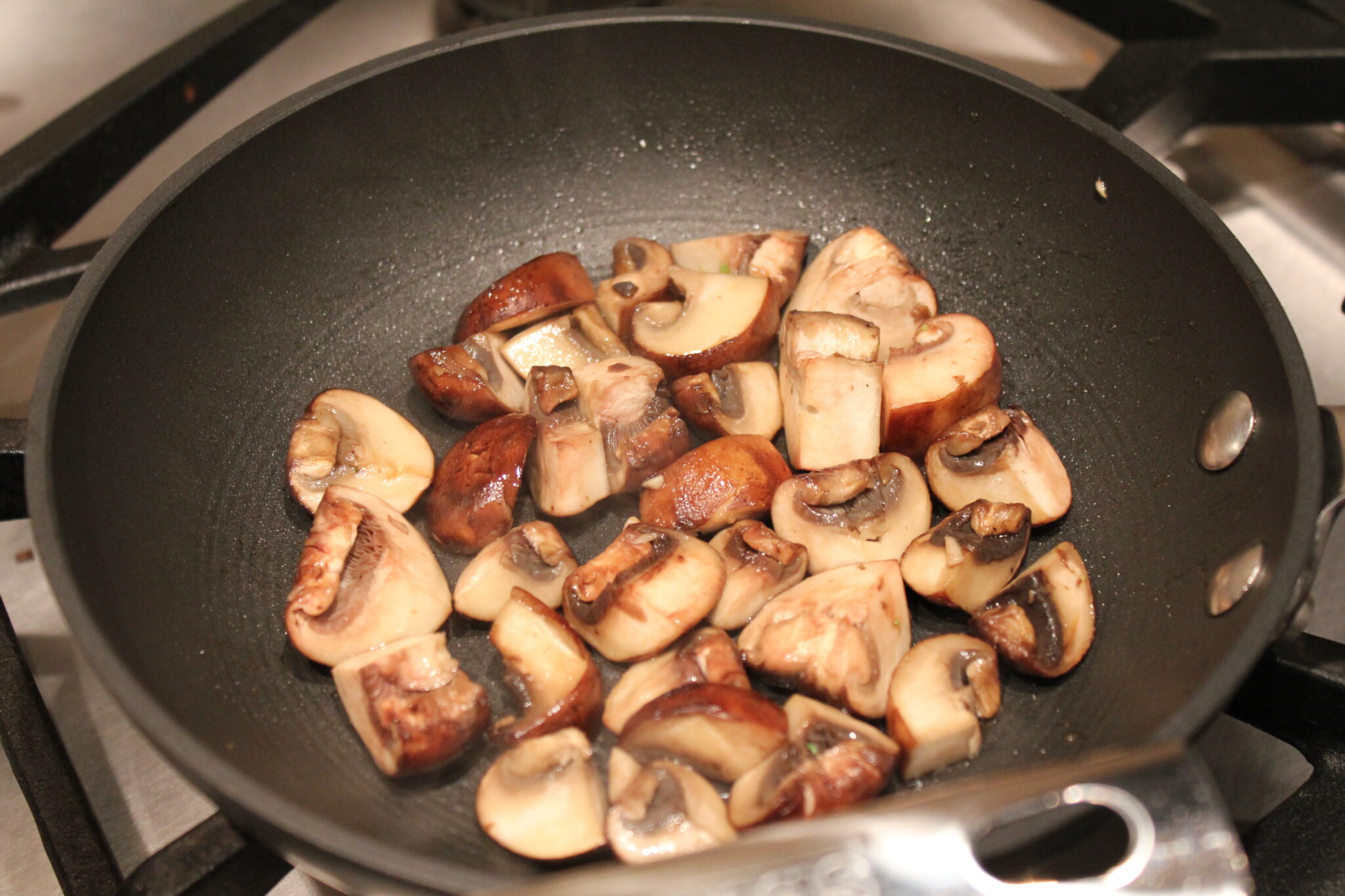 - In a small skillet sprayed with cooking spray, I cooked 6 chopped baby Portobello mushrooms sprinkled with salt. A few minutes before they were finished cooking, I splashed in 2T of white wine (I used Sauvignon blanc because that’s what I usually have on hand) and let it simmer to absorb the flavors. (You’ll notice that, in addition to the measurements that have changed, I’ve omitted the heavy cream, olive oil, and broth. Even without these, the dish had a great flavor!)