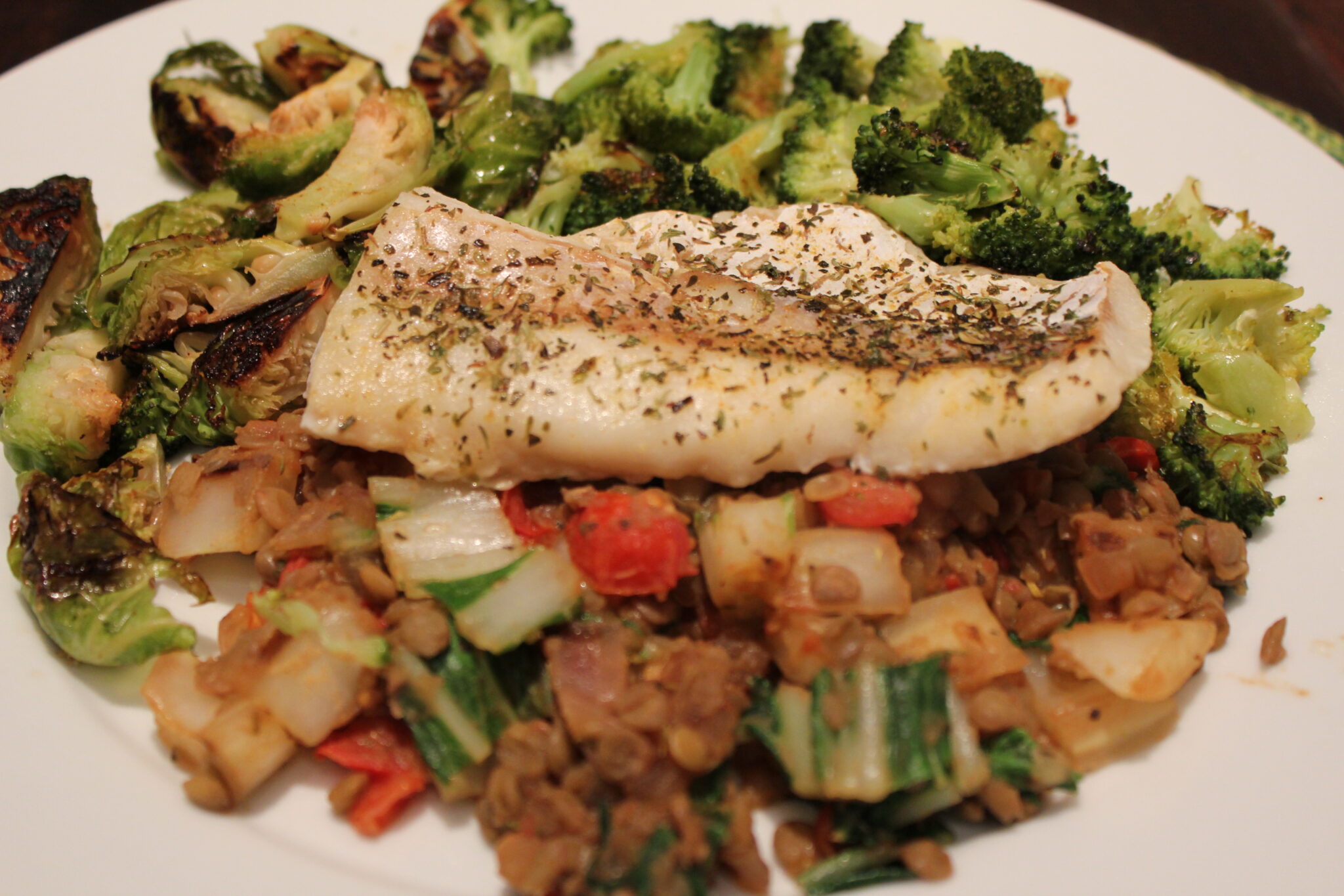 - Plate and enjoy! I loved this dish with some roasted vegetables and a filet of cod (I don’t buy cod very often, but Whole Foods had it on sale and I snatched it up. It was great!). The lentils will be a bit mushy, but if you don’t mind that, I think you’ll love this dish!