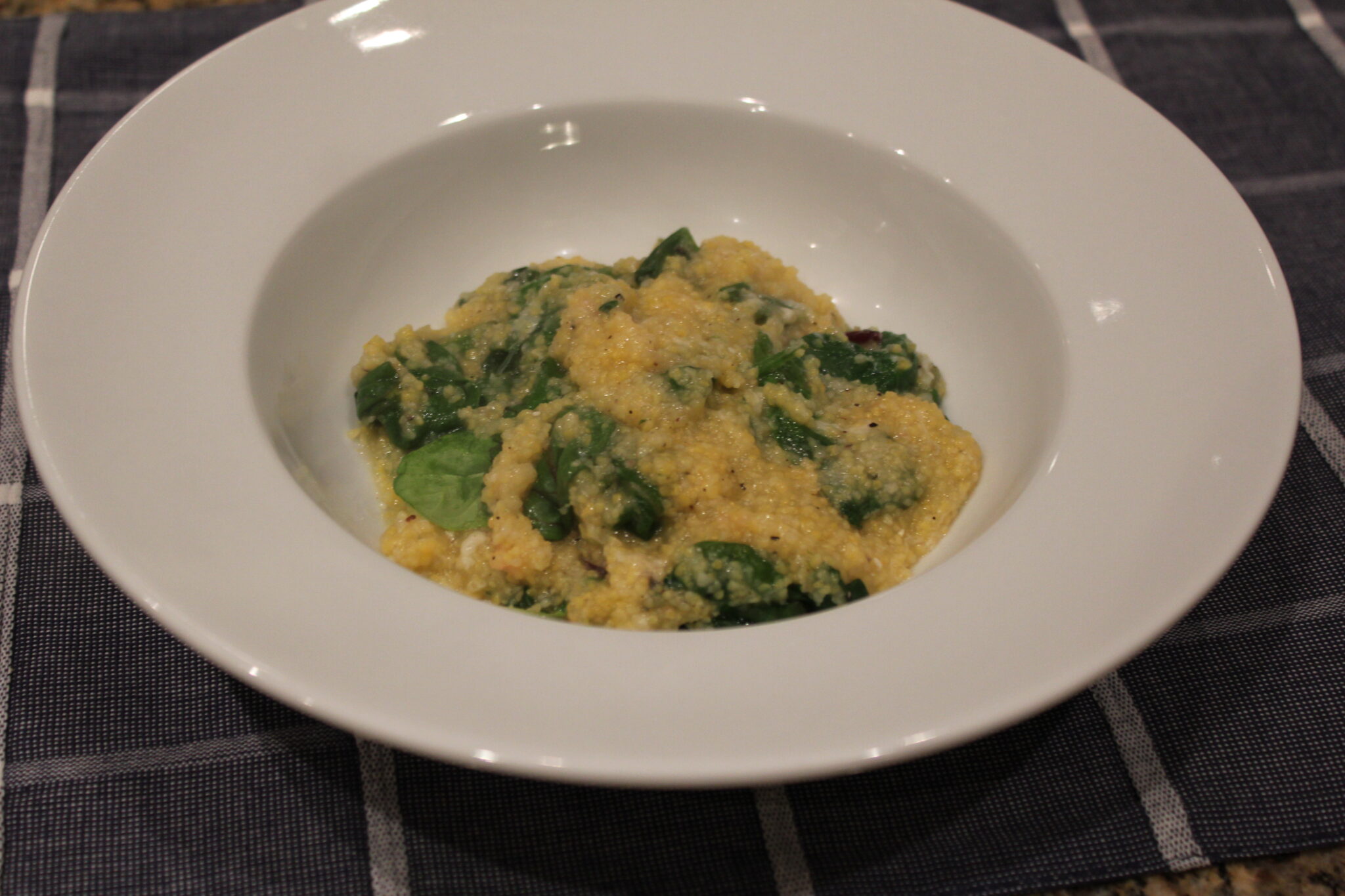 - I used about 3/4 a serving of Bob’s Red Mill organic polenta, and cooked it in water according to package instructions, but stirred in a giant handful of “power greens” (spinach, kale, and other greens mixture) and 2T shaved parmesan cheese before taking it off the heat.