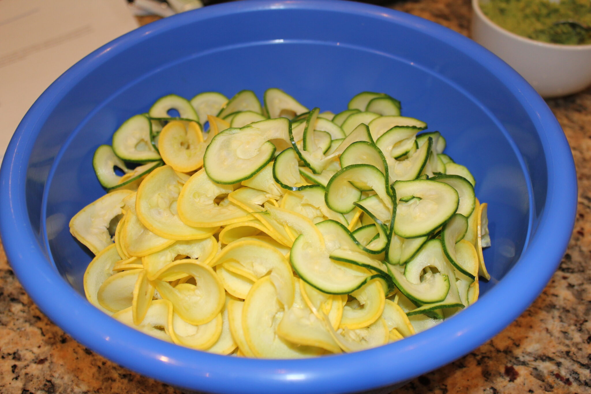 1. If you have a spiralizer, cut the ends off of 5-6 small squash or zucchini, and spiralize completely.  Look at Angela go!  If you don’t have a spiralizer, I wonder if you could cut into small matchsticks or even use a thicker setting on a hand grater … any thoughts? IMG_7039IMG_7043