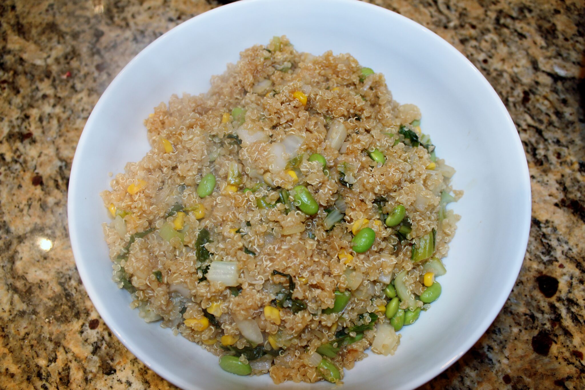 3. Once onion and bok choy are soft, add in quinoa, edamame, and corn.  Saute another 3-5 minutes.