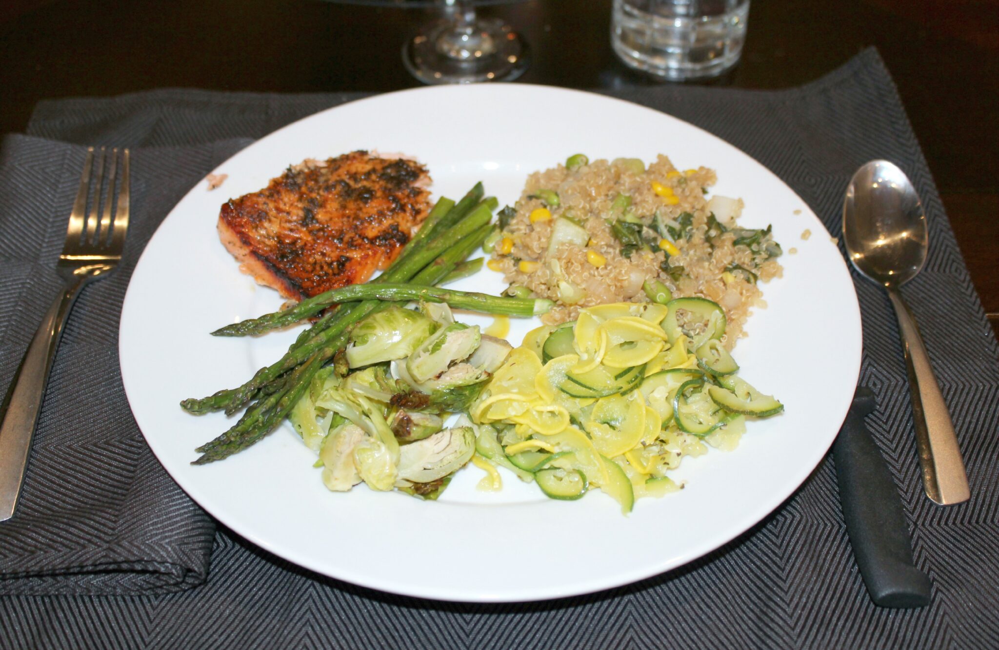 As we were chatting and cooking, we munched on veggies and tortilla chips with Homemade Basil Hummus and a Veggie-Loaded Guacamole.  For the main meal, we had a Lemon-Dill Broiled Salmon, Summery Squash and Zucchini “Pasta,” roasted asparagus and Brussels sprouts, and a Sweet and Savory Orange-Soy Quinoa.  We finished it off with a Healthy Peach Oatmeal Cake (and some vanilla ice cream).  Hey, with four hungry (but healthy) runners – what did you expect?  We needed a lot of food!  IMG_7044 IMG_7037 IMG_7063
