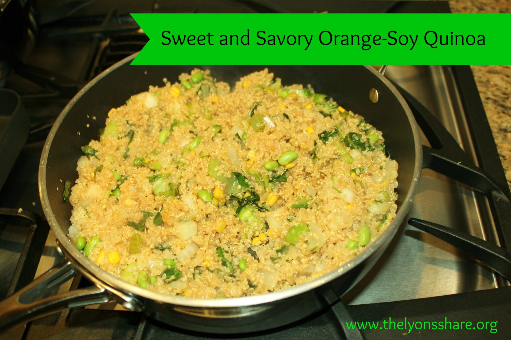 If made according to these instructions with 6 servings, each serving of  Sweet and Savory Orange-Soy Quinoa has 175 calories, 3g fat, 30g carbs, and 8g protein.