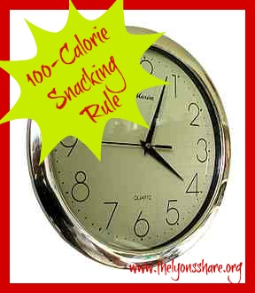 - If you are actually hungry, follow my 100-calorie Snacking Rule. I determine (about) how long it will be until my next meal, and multiply the number of hours by 100 to figure out the (approximate) calorie total for my next snack. So, if it’s 5pm, and I won’t be eating dinner until 7 or 7:30pm, I know that a 200-calorie snack will likely tide me over. This doesn’t mean that I feel the need to eat 100 calories every hour no matter what, but it helps me gauge the size of my snacks … If I am hungry several hours before my next meal, and I try to tide myself over with a small piece of fruit, I know I’ll be snacking again before long. Note that if you’re a (lucky!) male, are especially active, or are younger/ larger/ generally need more calories, the 100-calorie Snacking Rule might become the 150-calorie Snacking Rule for you. Experimentation is the best way to find out what works for YOUR body, and everyone is different!