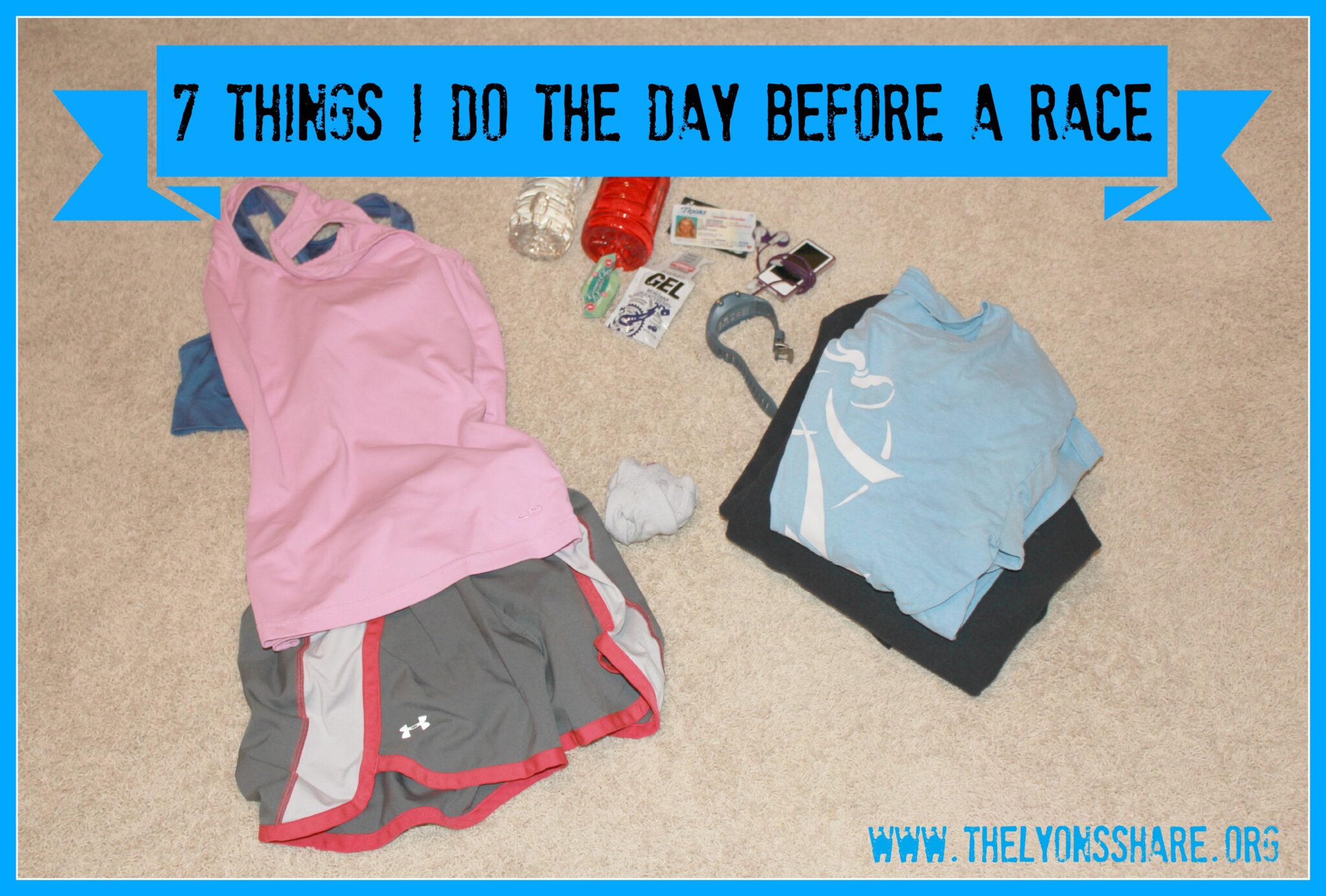 The day before I try to do as little as possible – depend in on the length of the race. My husband can attest that I am a very clumsy person before my last marathon I fell down the stairs at our apartment 3 days before…luckily I wasn’t hurt but I try to be very careful. Other than that I focus on eating right, hydration, and compression!