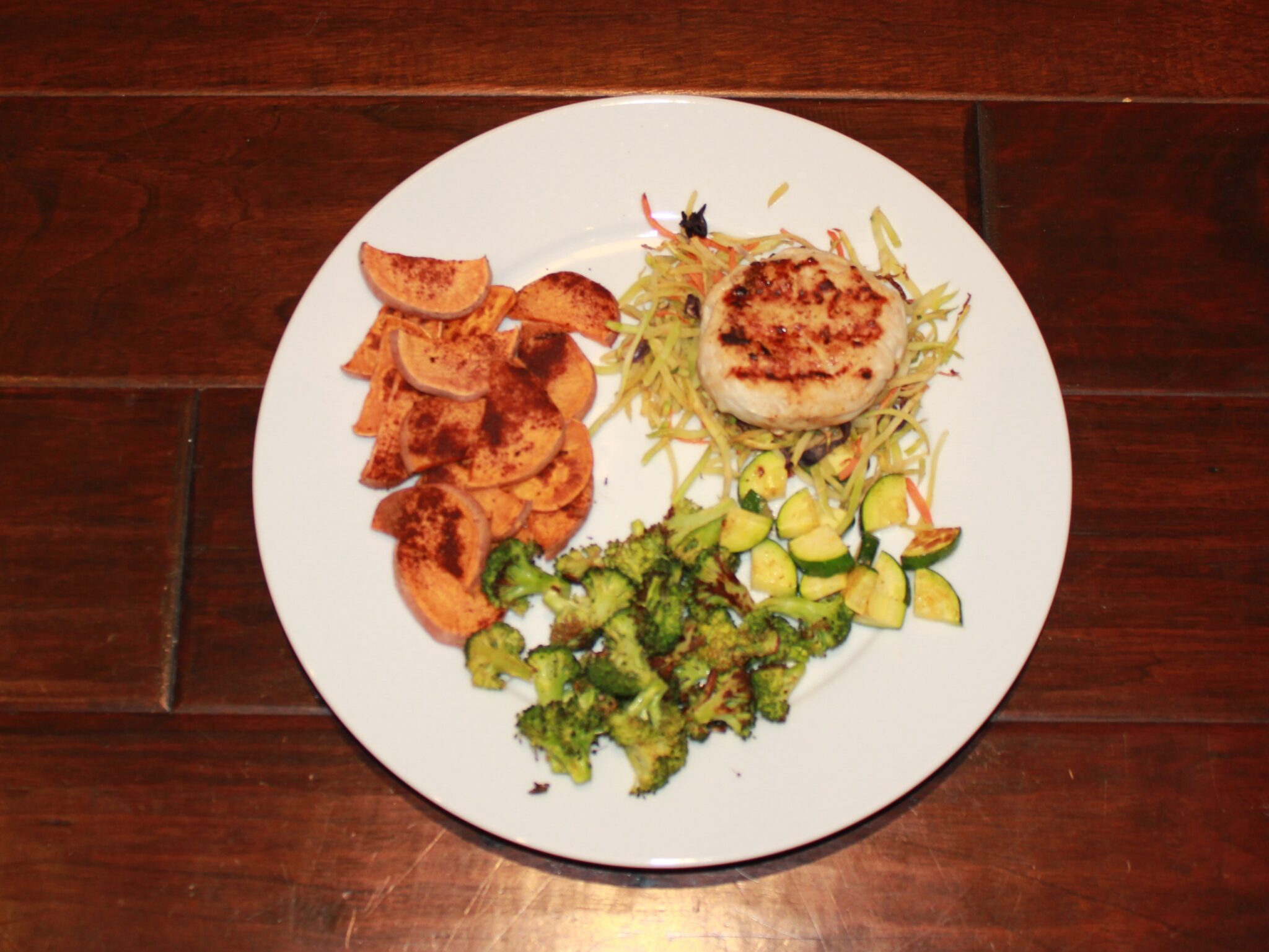 - For dinner, I had roasted sweet potato slices (always my carb-of-choice the day before a race … I love them, they’re full of nutrients, and they’re easy on my stomach), a lean turkey burger, and some veggies (most people recommend that you limit high fiber foods before a race, but I can’t stay too far away from my veggies!). Of course, there was lots of ketchup and mustard involved … lots of added sugar (and salt) like I explain in this post, but sooo worth it!