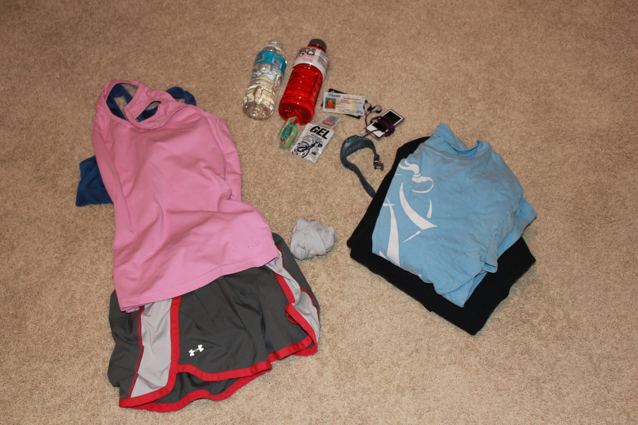 - Plan everything. If you’re waking up at 4:45am like I did, your brain is likely not working as well as usual! I ensure that I won’t forget anything by laying out my clothes for the race, extra clothes for before and after, water, my Garmin and iPod, fuel (I didn’t actually eat this during the race, but I like to have it in case), and anything else I’ll need for the run (if you already have your packet/ race number/ timing chip, don’t forget that!). Also, plan exactly how you’ll get to the race, and allow yourself extra time – a race is a perfect time to give yourself tons of cushion. You never know how parking may turn out, if you’ll need to hit the port-o-potty a few extra times, if the packet pick-up line will be extra long, or if you’ll get lost on the way, so by all means, leave early!