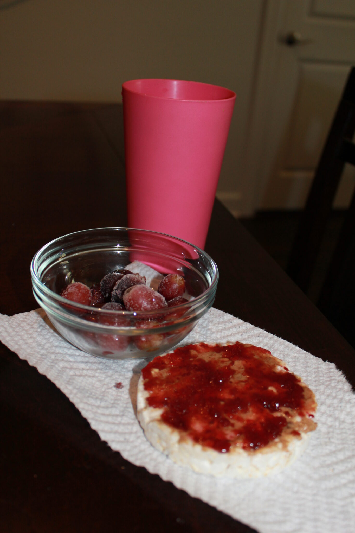 - For an afternoon snack, I had a rice cake with a smear of almond butter and jelly (just like a kid!), some frozen grapes, and an (unpictured) handful of trail mix.