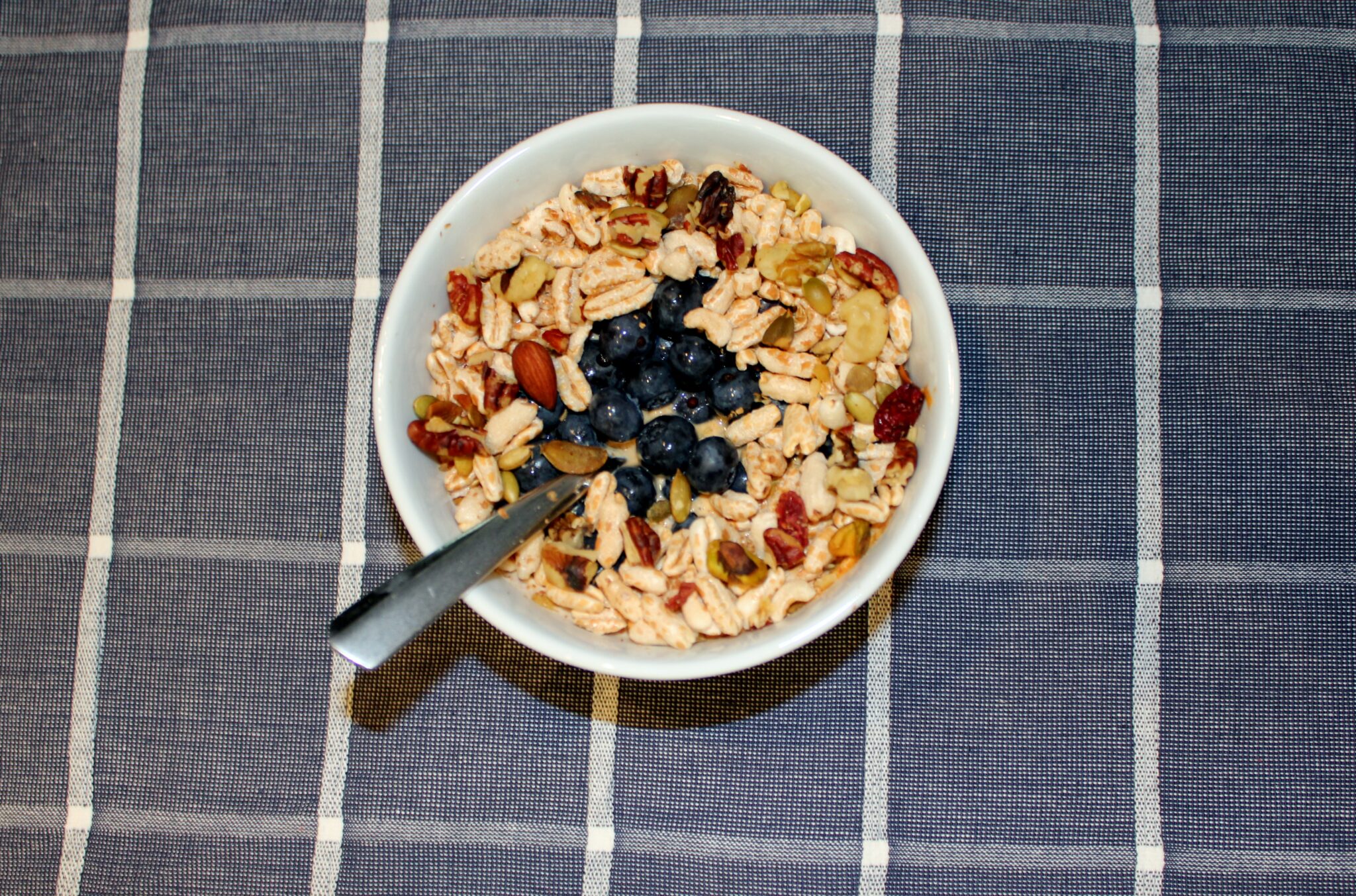 - I went with my standard breakfast (plain Greek yogurt, chia seeds, pumpkin, stevia, cinnamon) with blueberries, puffed millet, and a sprinkle of trail mix.