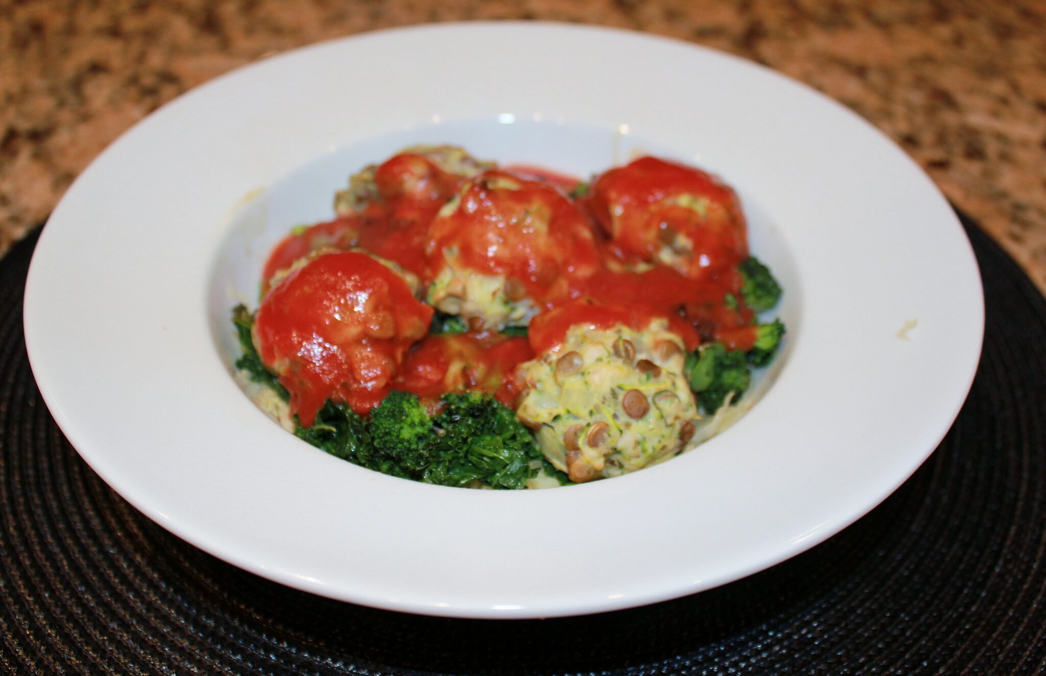 - Top spaghetti squash with veggies (this part is optional, but why not?!?). Place 5 meatballs (or 1/3 of the batch) onto each plate, and top with 1/4 cup of warmed tomato sauce.