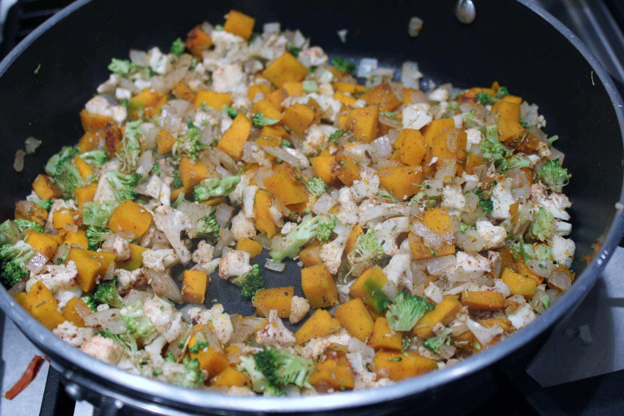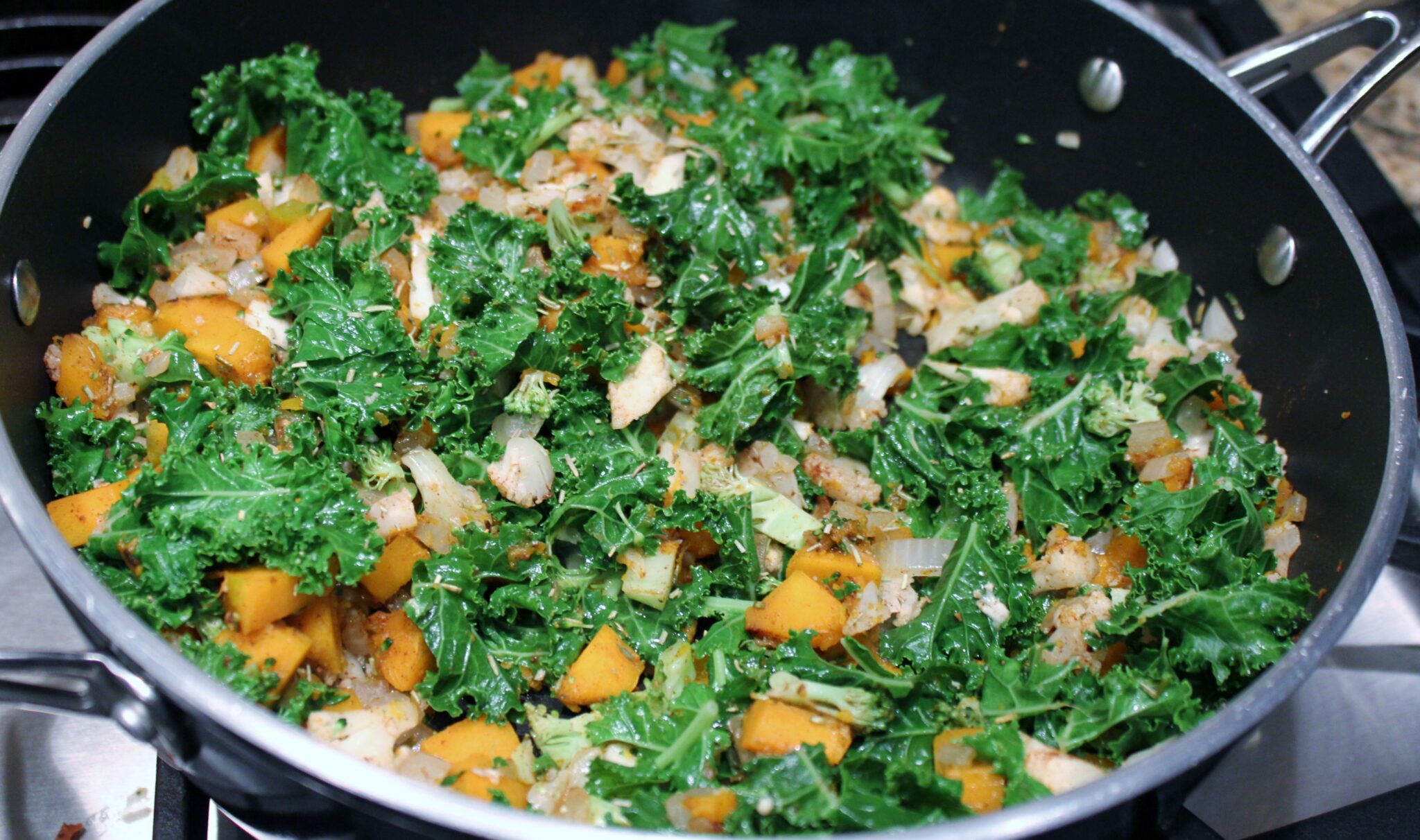 - In a large skillet, saute onion and garlic in olive oil for 3-5 minutes.ย Add broccoli, cauliflower, kabocha, kale, salt, pepper, rosemary, and cinnamon, and saute 5 more minutes until just starting to get tender.