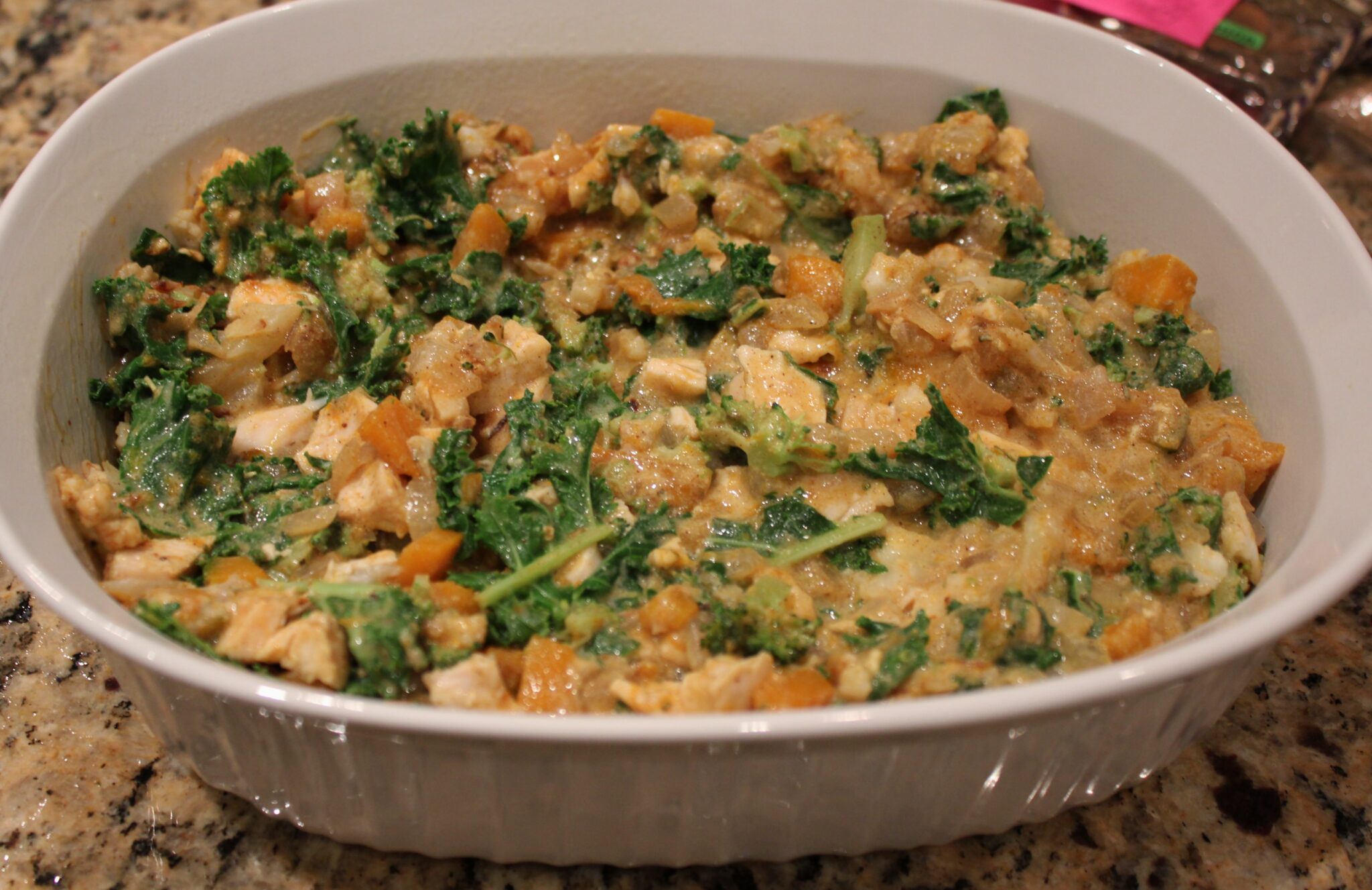 This warm, comforting, cheesy casserole has a hearty, satisfying flavor and a hint of sweetness.ย It’s a perfect introduction to Fall flavors, but won’t leave you feeling overly full or weighed down.ย It’s very easy to prepare (once you prep the squash!), and you’ll never even think about the fact that you’re getting 2-3 servings of veggies as you savor it!ย If you can’t find kabocha, I’m sure you could sub acorn or butternut squash, and if you prefer to avoid chicken, I bet a chicken substitute, some cannelini beans, or maybe even tofu, would work well!