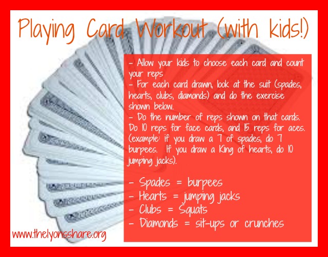 - Make it into a game. Try to make your workout fun, and create a “game” of it for your kids. Here’s a fun workout with playing cards that I made up for you to do with your kids. Or, so something as simple as playing hide and seek – but the “hider” and the “seeker” have to be on different floors, to force you to use the stairs.