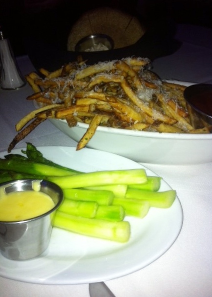…and we shared some steamed asparagus and truffle fries (doing it right for a celebration dinner!).