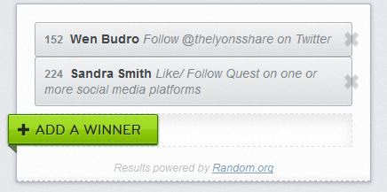 - Quest Giveaway winners: Finally, thank you for your entries in my Quest Bar Giveaway. The winners are below – if you’re a winner, send me your address and I’ll pass it along to the nice folks at Quest! If you didn’t win, I hope you still get a chance to try Quest Bars. And stay tuned, because I have 2 more giveaways lined up – coming in the next few weeks!