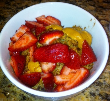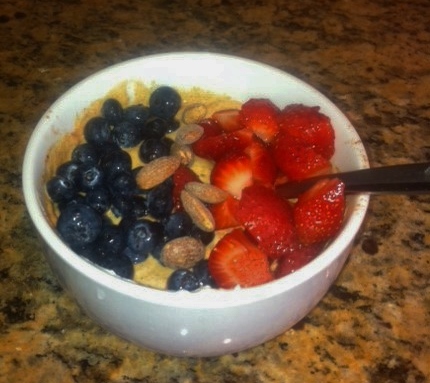 - Breakfasts. I enjoyed my favorite breakfast most days this week, but I changed it up with a green smoothie one day and a “sweet scramble” another: I just combine 1/2 cup egg whites, 1-2 T oats, 1-2 tsp. chia seeds, 1/4 cup unsweetened almond milk, 1/4 – 1/2 cup pumpkin, lots of cinnamon, and a few drops of stevia. Then pour in a saucepan and cook while stirring frequently. It takes on kind of an oatmeal texture and tastes delicious topped with almond butter and berries!