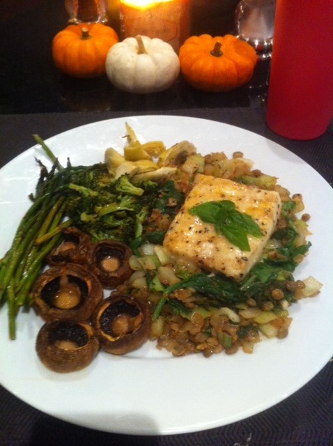 - Lots of veggie-filled meals. I already showed you my Autumn Harvest Soup with Apple Brussels Sprout salad and roasted veggies. I enjoyed a veggie and hummus dipping plate, plus a salad topped with leftover Creamy Kale Artichoke Dip mixed with chickpeas and lentils (don’t bash it until you try it!). Also pictured are a fish dinner with lentils and bok choy, plus extra roasted veggies, and a salad topped with leftover roasted veggies, beets, avocado, and goat cheese.