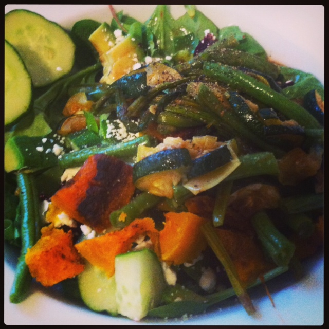 - Cracklin’ cauliflower from Eating Bird Food: this is a super easy recipe filled with a ton of spices that turn cauliflower from a “boring” side into the flavorful star of the show! I added cubed tofu to my cauliflower, and subbed in green beans for the peas in the original recipe. Served with extra roasted asparagus, mushrooms, and zucchini/ squash.