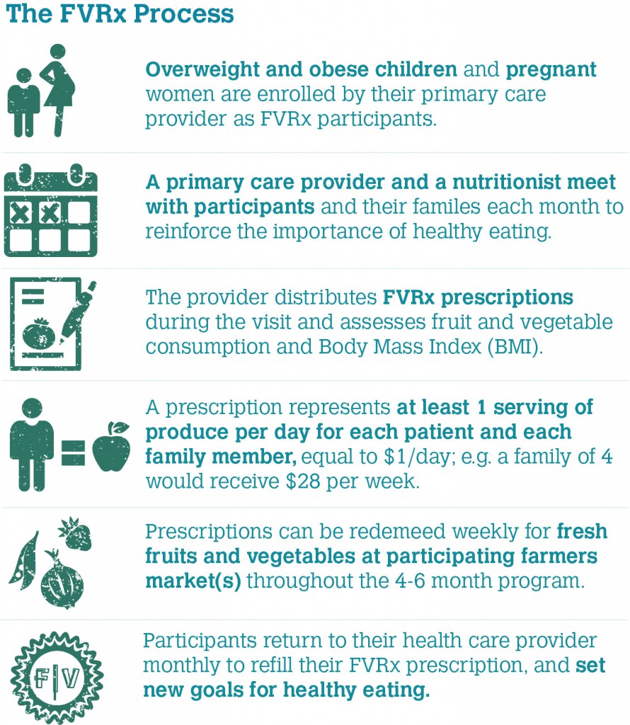 4. Fruit and Vegetable Prescriptions: This is one of my favorites!!  As a college economics major, of course my mind immediately goes to the economic impact of a program like this, but I feel confident that the increases in health will make the program economically viable.  After all, only 1.5% of Americans currently meet recommendations for fruit and vegetable intake … and it’s certainly not doing any favors for our healthcare costs!  Two hospitals in New York are offering patients prescriptions for “Health Bucks,” which are good for $2 vouchers per person per week, to spend on produce at Farmer’s Markets.  Another program called “Wholesome Wave” has been providing similar vouchers at $1 per person per day, and has shown amazing results (55% of participants increased fruit and vegetable consumption, and 38% of child participants decreased BMI!).  I believe that this program is a great way to get all those who argue that eating healthier is too expensive started on healthy living, while supporting local farmers! fvrx(picture source)