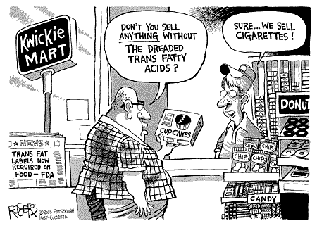 1. Trans Fat Ban: This one is the most recent, and probably the most surprising to me (in a good way).  As the prevalence of trans fats in foods we consume daily (including fried foods, baked goods, and many processed and packaged foods) has skyrocketed, we’ve also learned about the dangers of trans fats, which increase LDL (or “bad” cholesterol) and contribute to heart disease.  In the past, the FDA has allowed manufacturers to report “0g trans fat” when the levels were less than 0.5g per serving, but given that any amount of trans fat is dangerous, eating several servings of “og trans fat” items that actually contained 0.45g per serving was an un-labeled risk.  There are easy ways to make the same foods without trans fats – cities like New York and Philadelphia that have already banned trans fats are surely not lacking in fried foods or baked goods.  However, the FDA is now stepping in to potentially eliminate trans fats all together. I do understand the argument that eliminating trans fats all together is a bit too interventionist for some, but to me, anything we can do that improves the health of citizens so dramatically (without decreasing the quality of life or reducing the choices available to these citizens) is a win; I support this potential ban.  (By the way, Amy did a great post about this, extending the discussion from just trans fats and to overall responsibility for health … check it out!) trans fat comic(picture source)