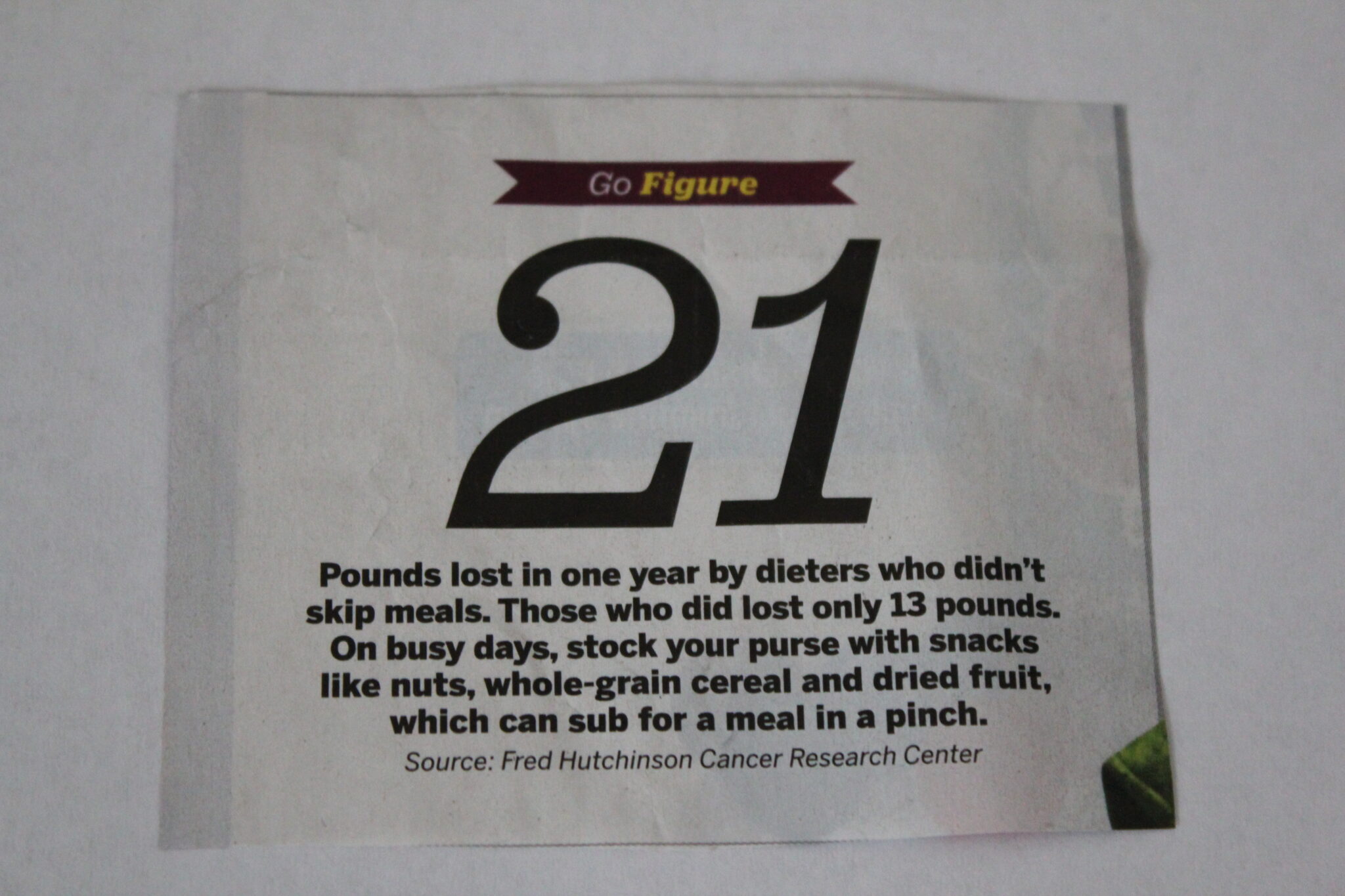 Another reason not to skip meals: A Fred Hutchinson Cancer Research Center study (again done on overweight and obese individuals) showed that those who did NOT skip meals lost 8 MORE pounds than those who did occasionally skip meals. I told you in this post (one of my first ever!) how important breakfast was, but consider this another reminder that skipping meals won’t help you in your journey to become healthier – because you’ll likely end up bingeing or over-eating later. (Unfortunately, I forgot to save the source for this magazine clipping).
