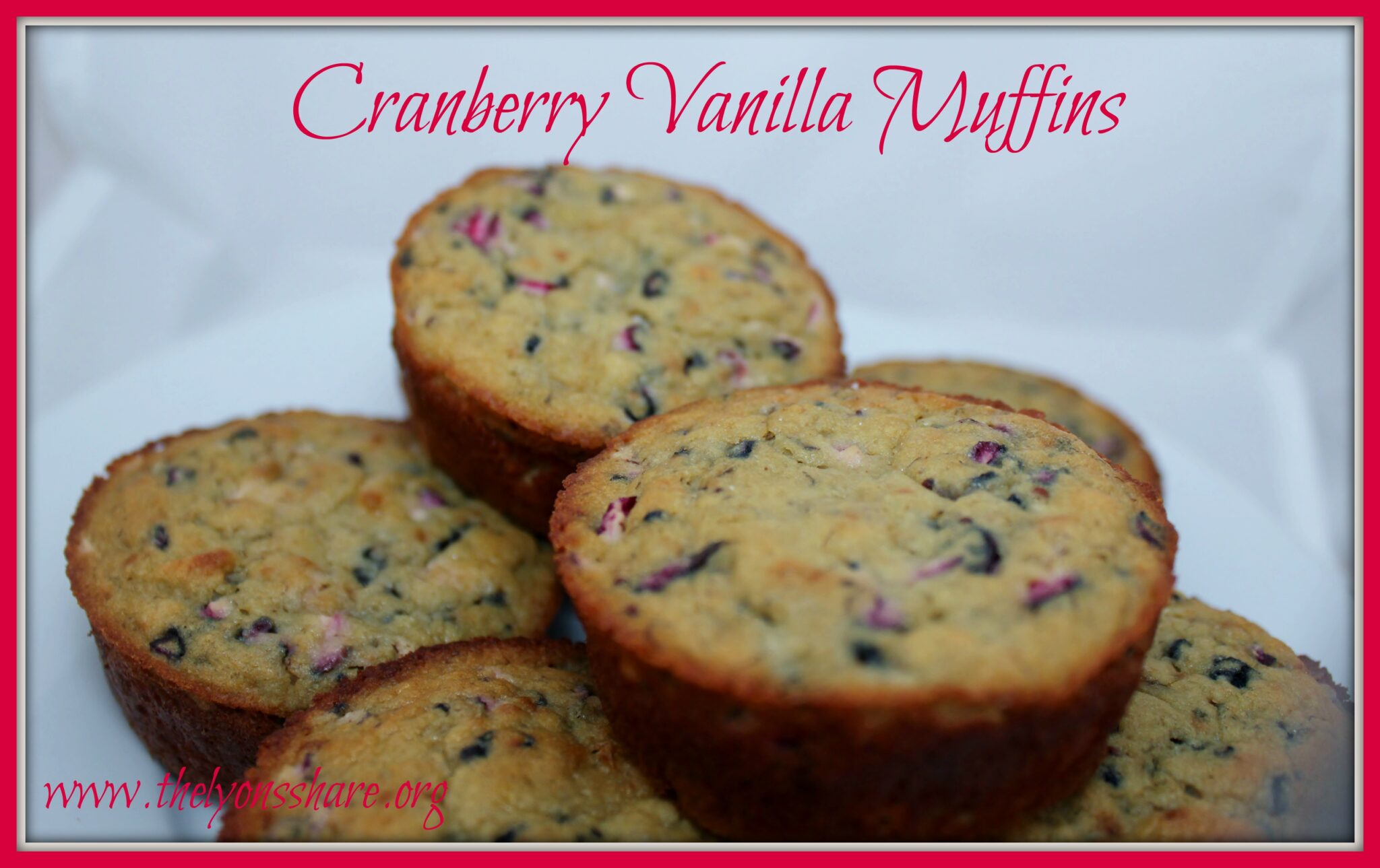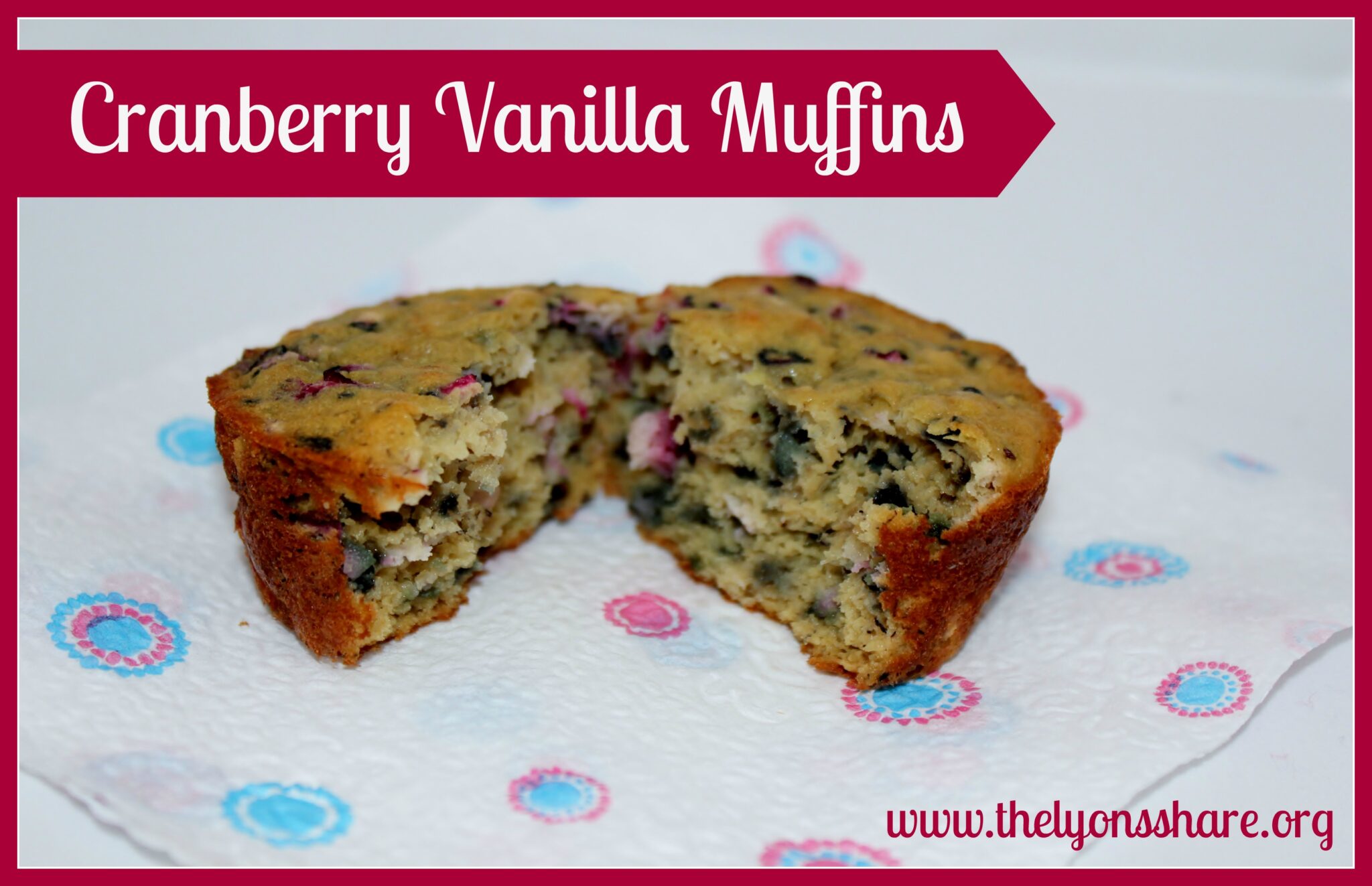 I’m sure I’ve mentioned it before, but I despise wasting food.  I just can’t make myself do it!  So when I was left with most of a bag of cranberries after making my Christmas Cranberry-Orange Brussels Sprouts last week, I knew I’d have to create another recipe that used them.  Well, my Cranberry Vanilla Muffins were born, and I liked them!  They’re not overly sweet, and are much more of a breakfast muffin than a dessert muffin.  They have a bit of a protein punch, and have no added sugar, so they’re a very healthy way to enjoy a muffin without a heavy feeling or a sugar rush.  I hope you enjoy these at your next brunch! cranberry vanilla muffins The Lyons Share