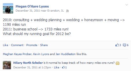 Here’s a funny Facebook flashback with my 2011 total of 1733 miles (a huge jump from my very busy 2010, when I got in 1190 miles!). One of my good friends reminded me that it is quite strange to actually keep track of all of this in the comments. Hey, I’ll admit that I’m a bit of a dork when it comes to things like this. But really, I think most runners are!