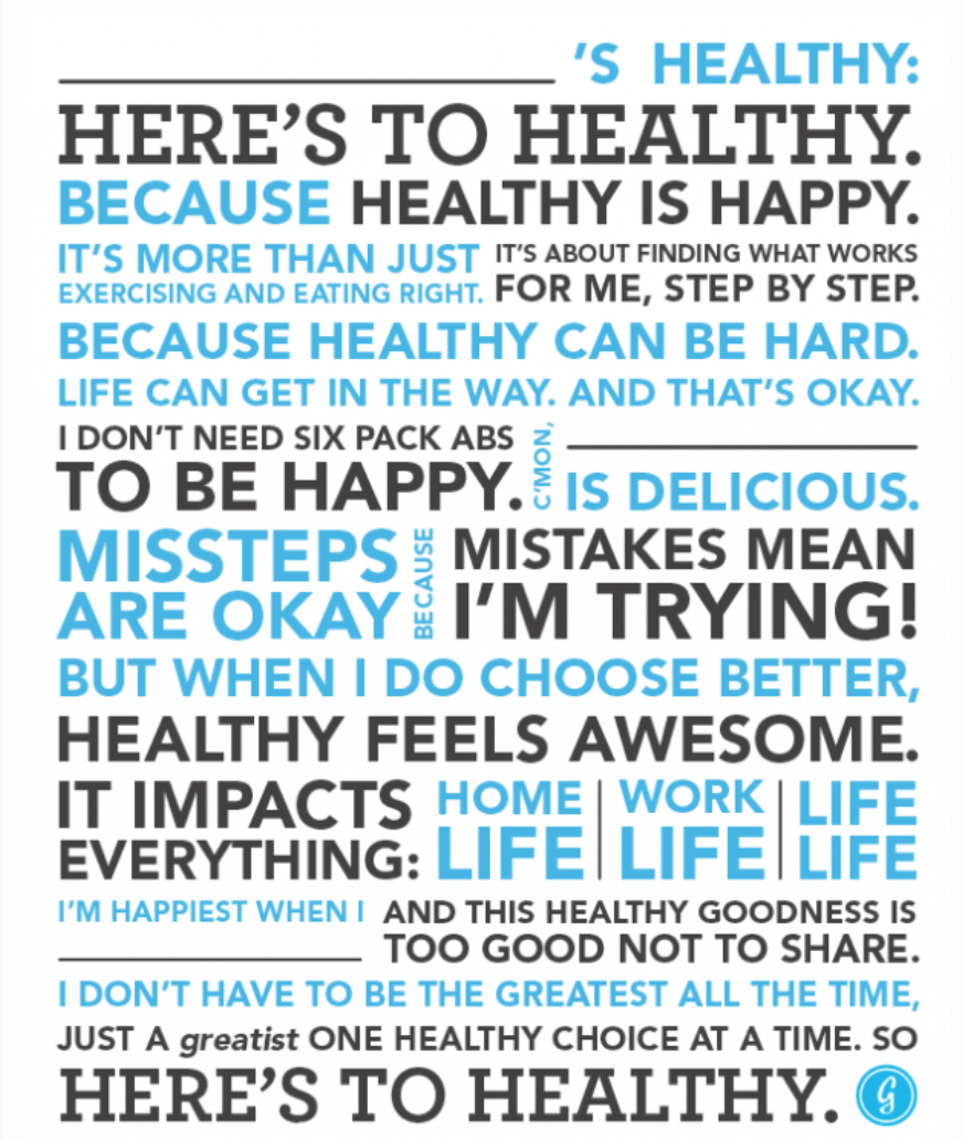 The great news about this journey is … mistakes are OK! Β We all make them, and slipping up every once in a while does not mean we are failing at our healthy living journeys. Β But when you do your best, and take conscious steps to improve your health, you usually feel amazing – both mentally and physically – and are inspired to do even more. Β My favorite part of the below Greatist quote is “But when I do choose better, healthy feels awesome. Β It impacts everything.” here's to healthy - blog 3.31.14(picture source)