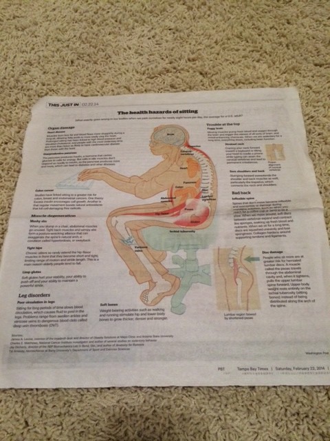 Anyway, the Post article cited many dangers of sitting too often. Â I’ve chosen my top 10 (in no order) to share with you.