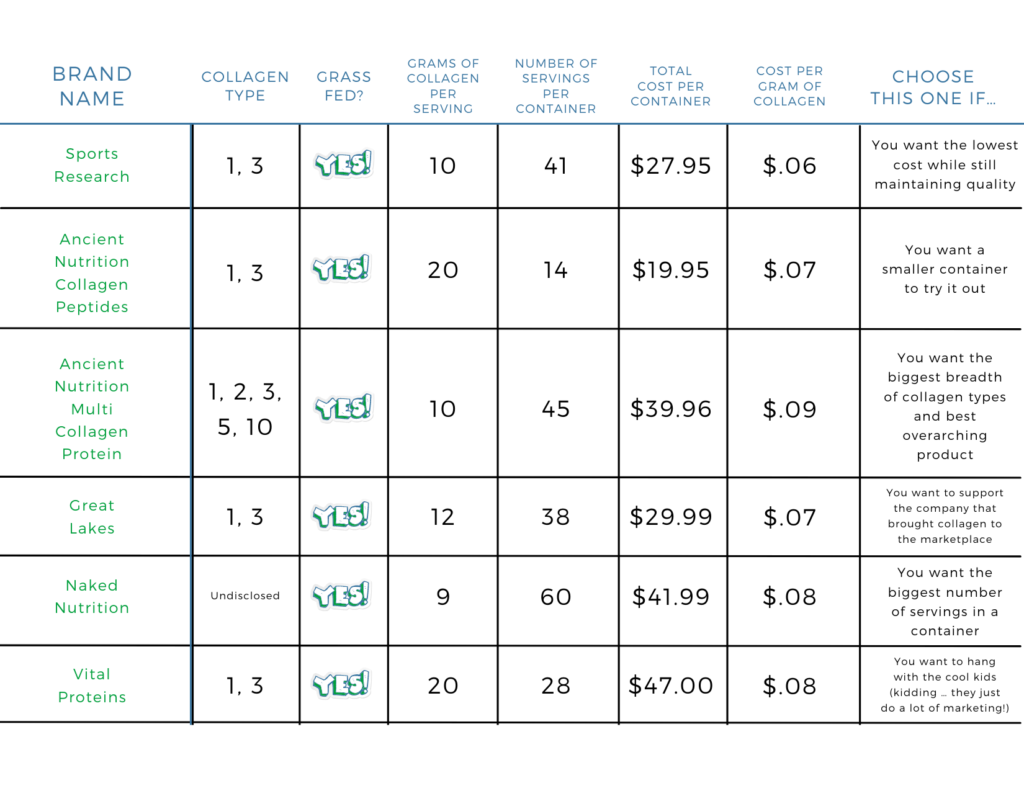 Here is a chart comparing the types and cost of each of the best brands of collagen: