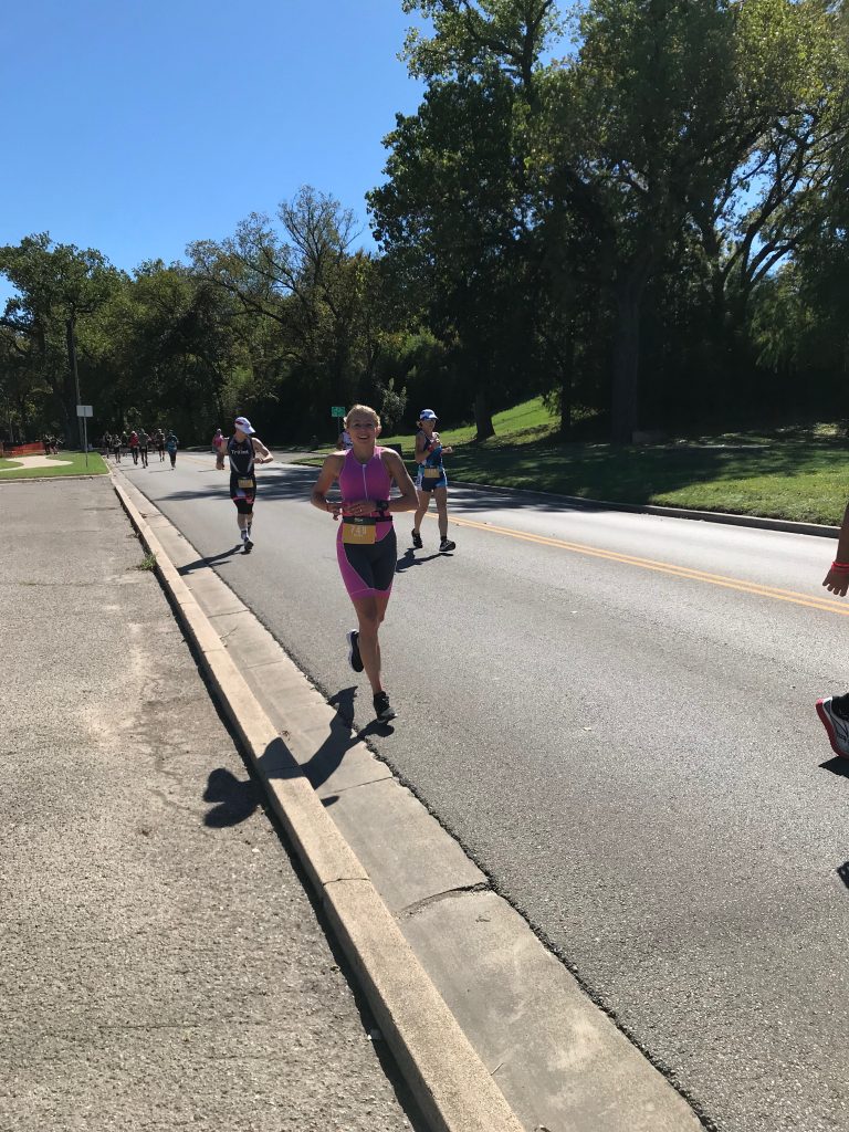 I felt amazing during the first portion of the bike. In hindsight, I know I could have pushed harder, but one of the big challenges of long distance triathlon is not pushing too hard on the bike (because, after all, you have to run a half marathon when you get off!). The course was well marked and well policed at intersections, and the roads were relatively smooth. It was a gradual climb for the first half, with rolling hills and a gentle decline in the second half. While I know how to change a bike tire, it takes me a LONG time to do so, so I was comforted that I saw bike techs every 5 miles or so sweeping the course. I had significantly increased my time on the actual bike (vs. stationary bike) since training for Galveston, so I felt more confident in this portion. I went about 14 minutes faster in Waco, despite the 1499 ft elevation gain and very windy back half of the course (3:17:56, or 16.98 mph, for 27th in my age group).