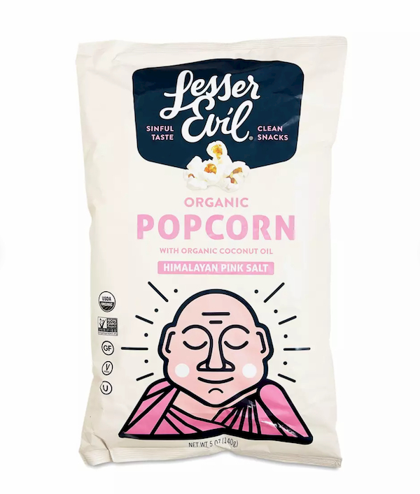 - Lesser Evil Organic Himalayan Pink Salt Popcorn: I love that this popcorn uses organic extra virgin coconut oil and non-GMO corn. It’s the healthiest popcorn I’ve found, and it tastes amazing!