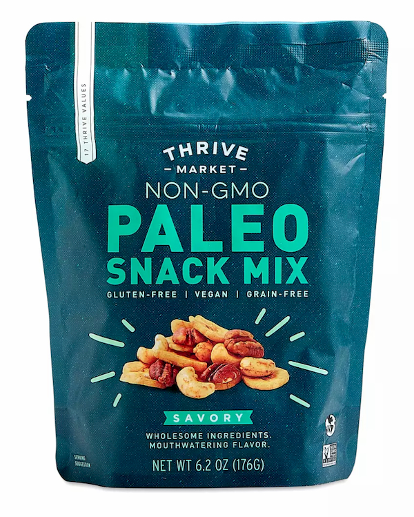 - Thrive Market Paleo Snack Mix, Savory: a unique trail mix alternative with no added sugar, no junky ingredients, and an addictive taste. I’m sure to portion out a serving so I don’t eat the whole bag, which I easily could do if mindlessly eating!
