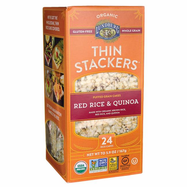 - Lundberg Family Farms Red Rice & Quinoa cakes: I love putting a nut butter spread on these thin rice cakes … it’s a quick snack that tides me over (due to the fat from nut butter) and tastes great!