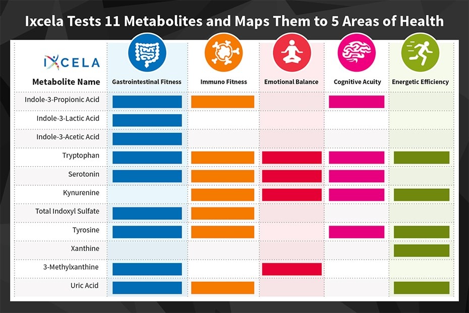 The Ixcela test uses a pinprick of blood (about the size of a quarter) to measure how well the bacteria in your gut are performing their jobs and creating the various chemicals your body needs. Ixcela is looking at small compounds in the blood called metabolites. These metabolites (Indole-3-Acetic Acid, Indole-3-Lactic-Acid, Tyrosine, Uric Acid, Xanthine, 3-Methylxanthine, Indole-3-Proprionic-Acid, Total Indoxyl Sulfate, Kynurenine, Serotonin, and Tryptophan) each have an important role in your overall health.