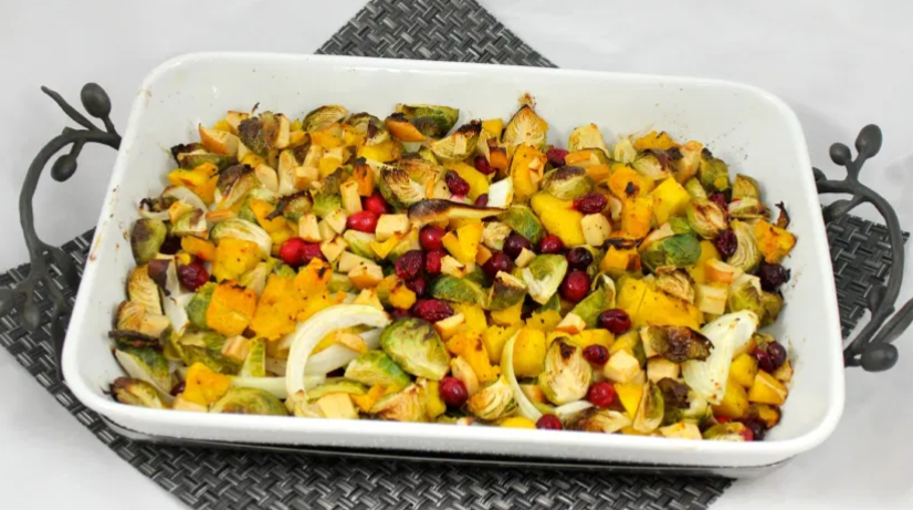 - 1/3 of your plate is full of veggies! Salad, roasted root veggies, braised green beans, roasted cauliflower, Holiday Brussels Sprouts and Acorn Squash Bake, sauteed spinach, you name it … enjoy!