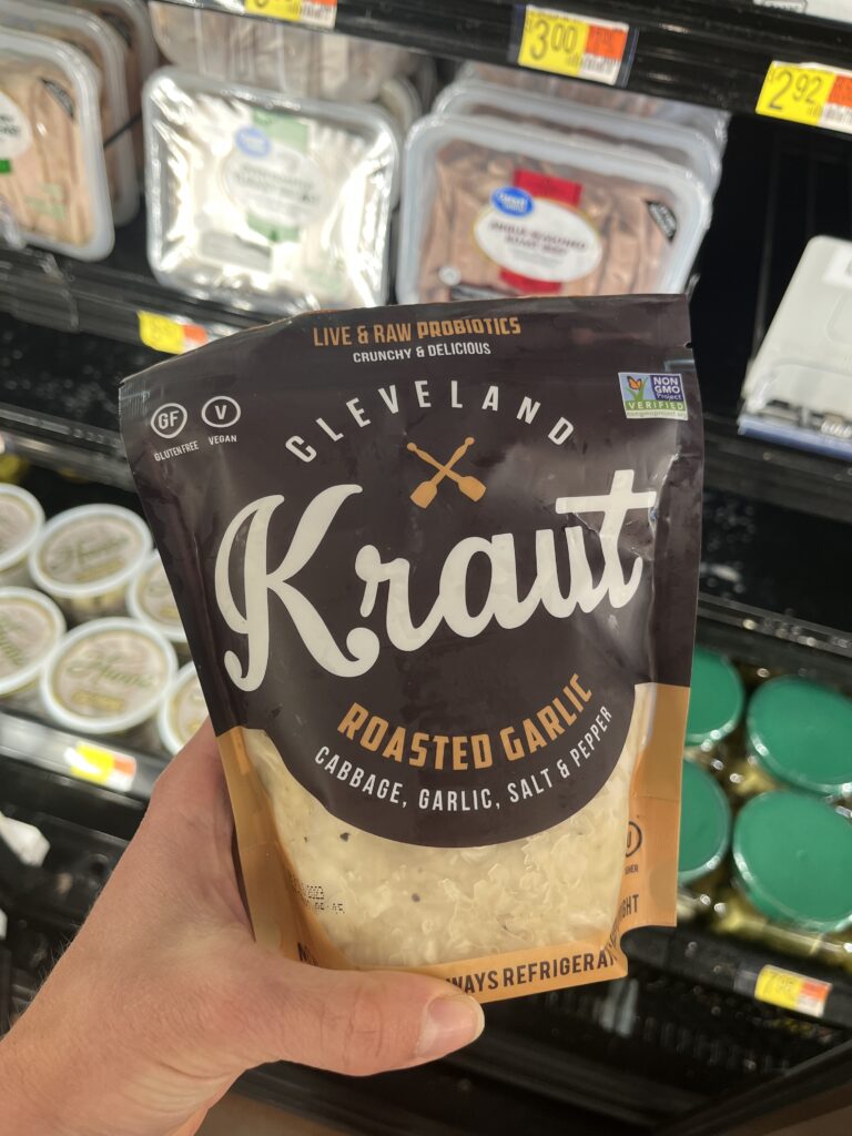 - Cleveland Kraut. Did you know that the probiotic benefits of sauerkraut only come in refrigerated varieties? Most varieties on the shelf are not actually fermented, but rather use vinegar to taste like they’re fermented. This Cleveland Kraut has simple ingredients, a great kick of flavor, and tons of gut health benefits!