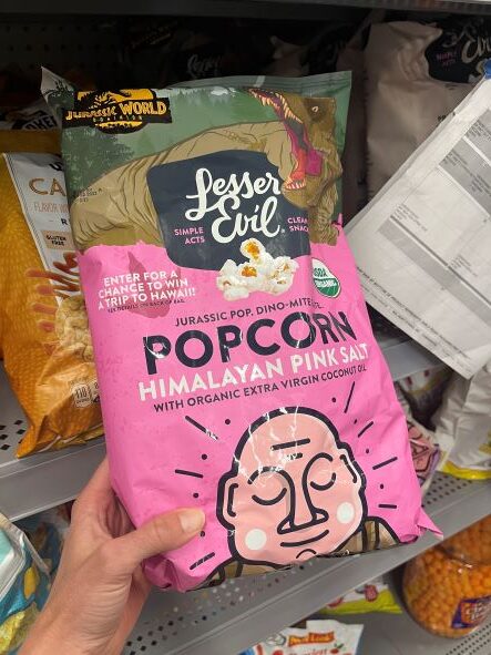 - Lesser Evil popcorn. Popcorn is not a blood sugar friendly option in general, but it sure is tasty! And if you’re going to go for popcorn, one cooked in coconut oil like this one is the best you can do! Plus, this variety is incredibly tasty! I like to combine it with a handful of nuts for a more balanced and delicious munchy snack.