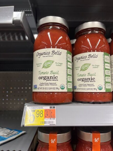 - Organic Bello marinara sauce. I’m constantly on a quest to find lower cost, organic, no sugar added pasta sauces for Kevin, and he loves the flavor of this one. At $5.98, it’s less expensive than Rao’s, but honestly, the Kroger store brand is half the price and just as tasty.