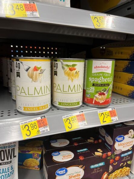 - Palmini noodles. I have yet to see these in can, but these are a great option for those who love noodles but are looking for a lower carbohydrate, higher fiber, overall healthier option. They have a slight tang, but adapt well to any sauce – from a healthy pesto to a lower sugar marinara sauce! Add some protein and you have yourself an easy meal!