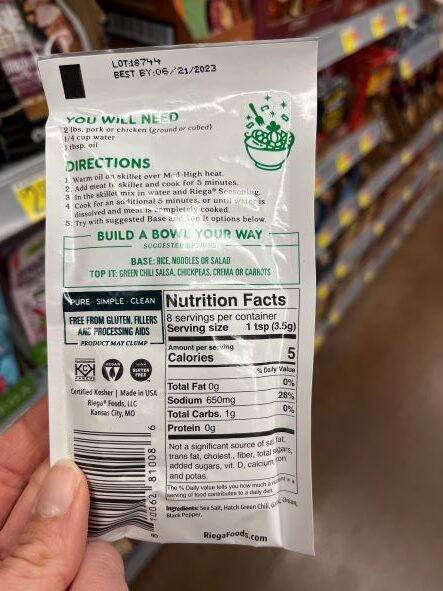 - Riega spice packs. I had never seen these Riega spice packs prior to checking them out at Walmart, and I was very impressed by the ingredients! Just like broths, most spice packs are filled with ingredients I’m not thrilled about. Containing only sea salt, hatch green chili, garlic, onion, and black pepper, I’m thrilled about this option and will happily use it to season meats or soups in the future!