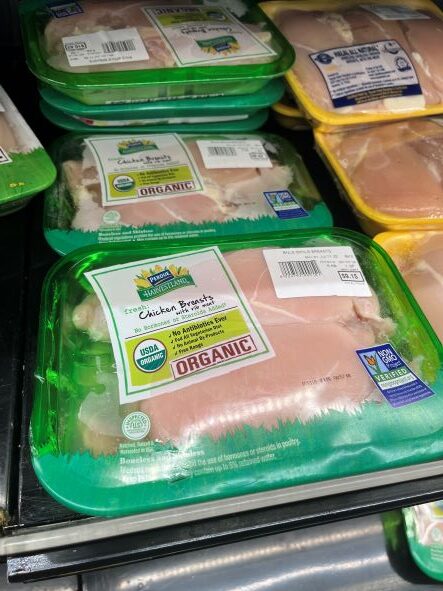 - Organic chicken breasts. Chickens are never fed hormones in the US, so the labeling is often misleading, but the “USDA Organic” and “free range” here are meaningful, and contribute to a better life for the chickens and better health for us!