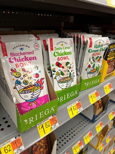 - Riega spice packs. I had never seen these Riega spice packs prior to checking them out at Walmart, and I was very impressed by the ingredients! Just like broths, most spice packs are filled with ingredients I’m not thrilled about. Containing only sea salt, hatch green chili, garlic, onion, and black pepper, I’m thrilled about this option and will happily use it to season meats or soups in the future!